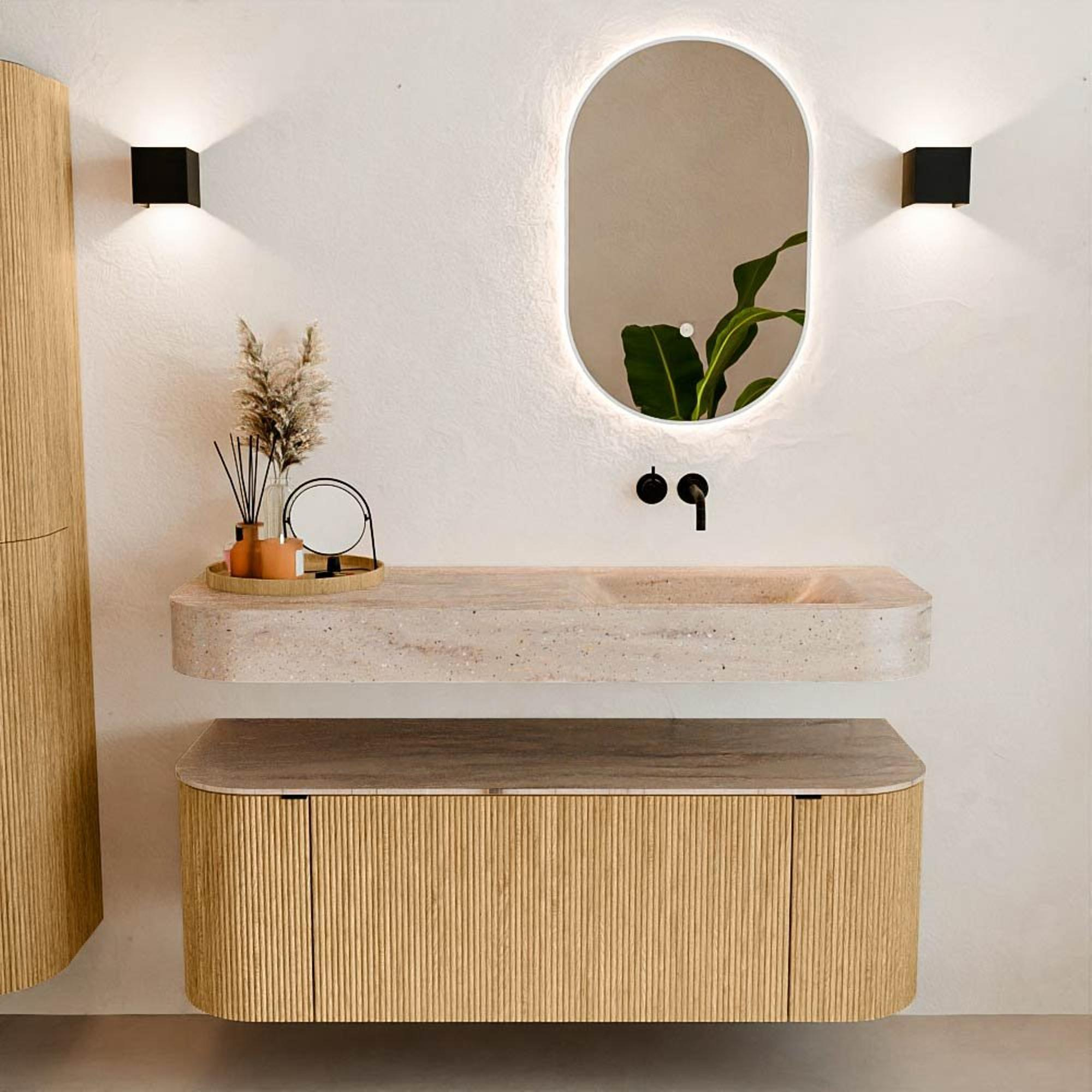 Natuurlijke materialen in warme tinten. De verticale ribbels brengen ritme en textuur in het ontwerp, terwijl het eikenhout zorgt voor een warme, ambachtelijke uitstraling. Kies uit 5 houttinten OAK, WALNUT, DUSK, SHADOW en RUBY zorgvuldig geselecteerde houtkleuren om zowel moderne als klassieke badkamers te verrijken.