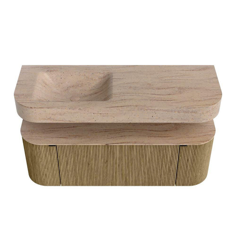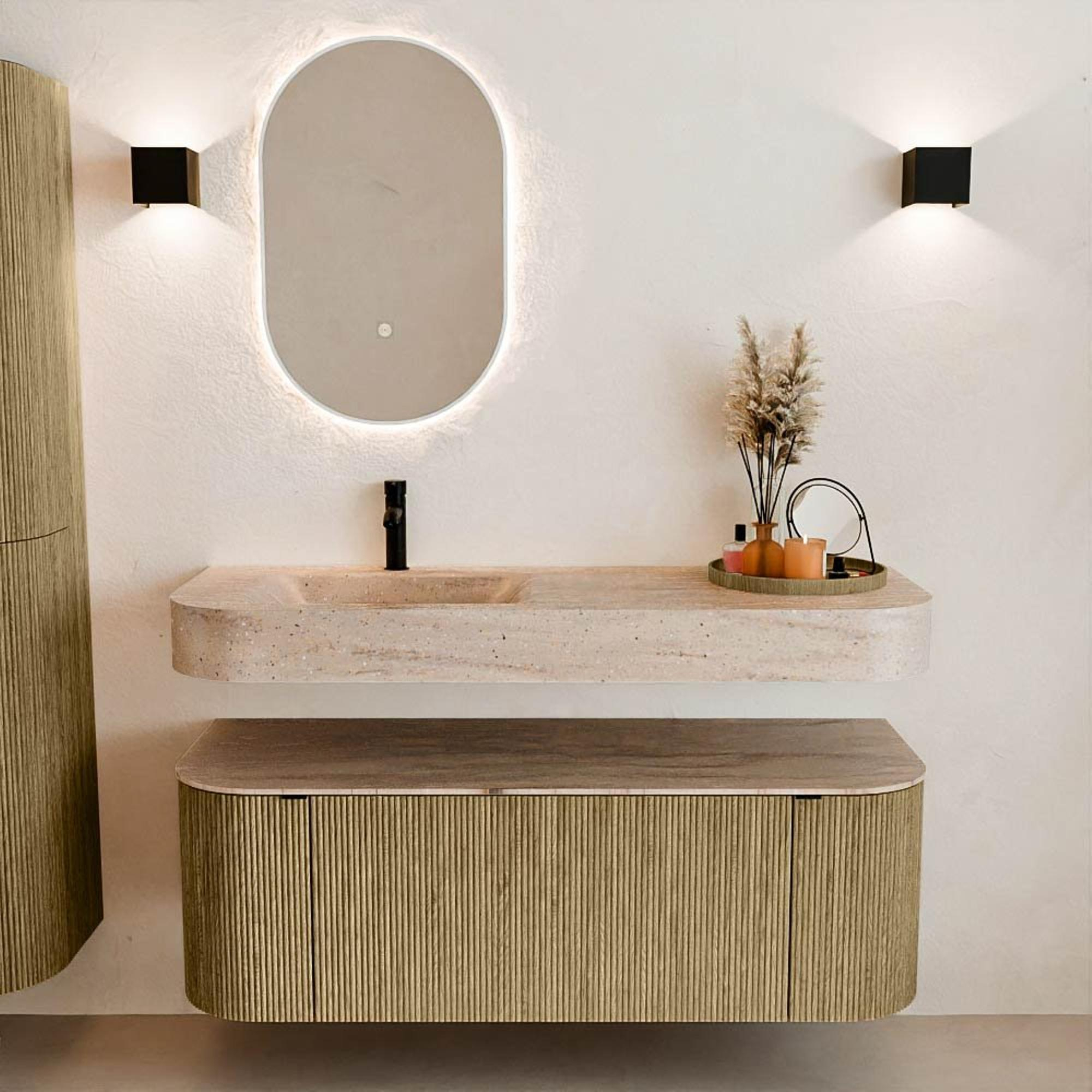 Natuurlijke materialen in warme tinten. De verticale ribbels brengen ritme en textuur in het ontwerp, terwijl het eikenhout zorgt voor een warme, ambachtelijke uitstraling. Kies uit 5 houttinten OAK, WALNUT, DUSK, SHADOW en RUBY zorgvuldig geselecteerde houtkleuren om zowel moderne als klassieke badkamers te verrijken.