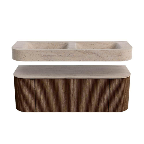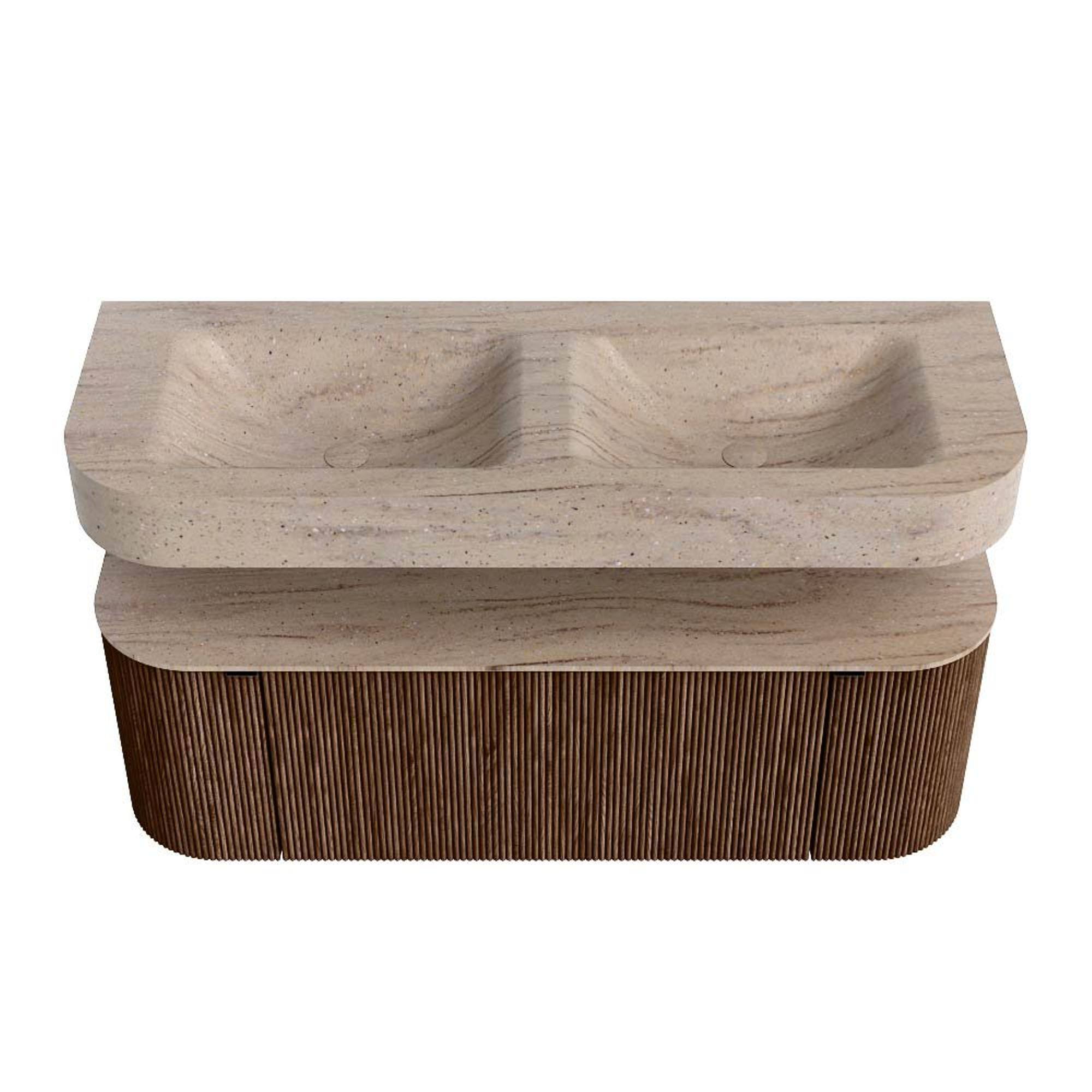 MONDIAZ THOR-DLUX 130cm badmeubel ronding links + rechts kleur Walnut met 1 lade en 2 deuren. Vrijhangende wastafel CLOUD Dubbel 2 kraangaten kleur Saba.