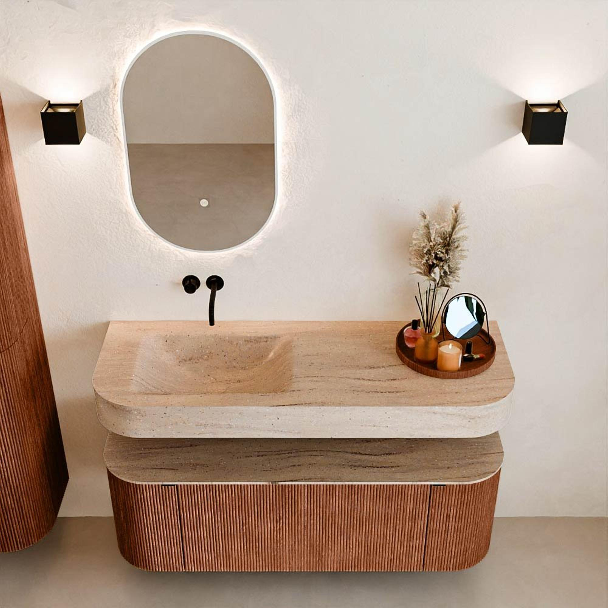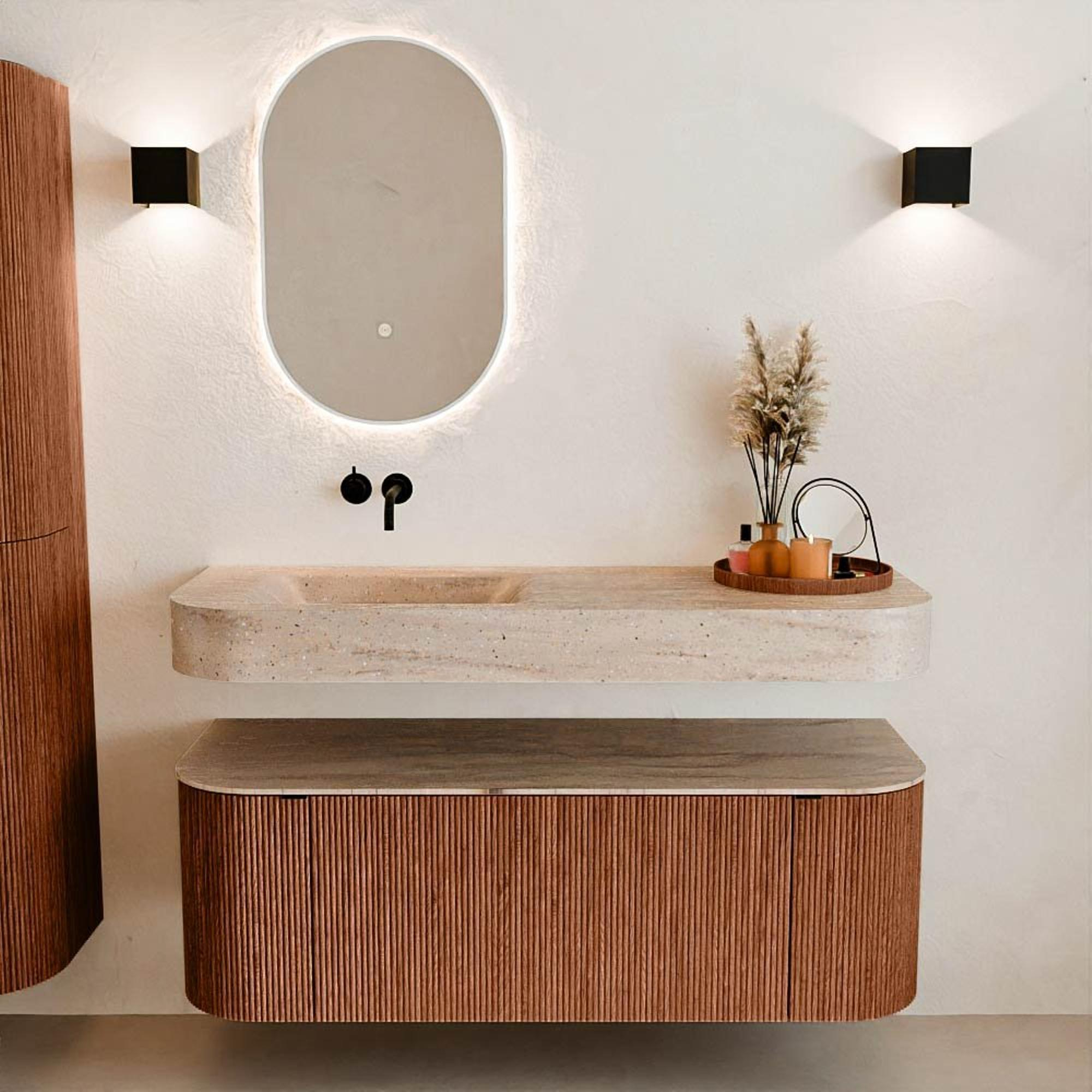 Natuurlijke materialen in warme tinten. De verticale ribbels brengen ritme en textuur in het ontwerp, terwijl het eikenhout zorgt voor een warme, ambachtelijke uitstraling. Kies uit 5 houttinten OAK, WALNUT, DUSK, SHADOW en RUBY zorgvuldig geselecteerde houtkleuren om zowel moderne als klassieke badkamers te verrijken.