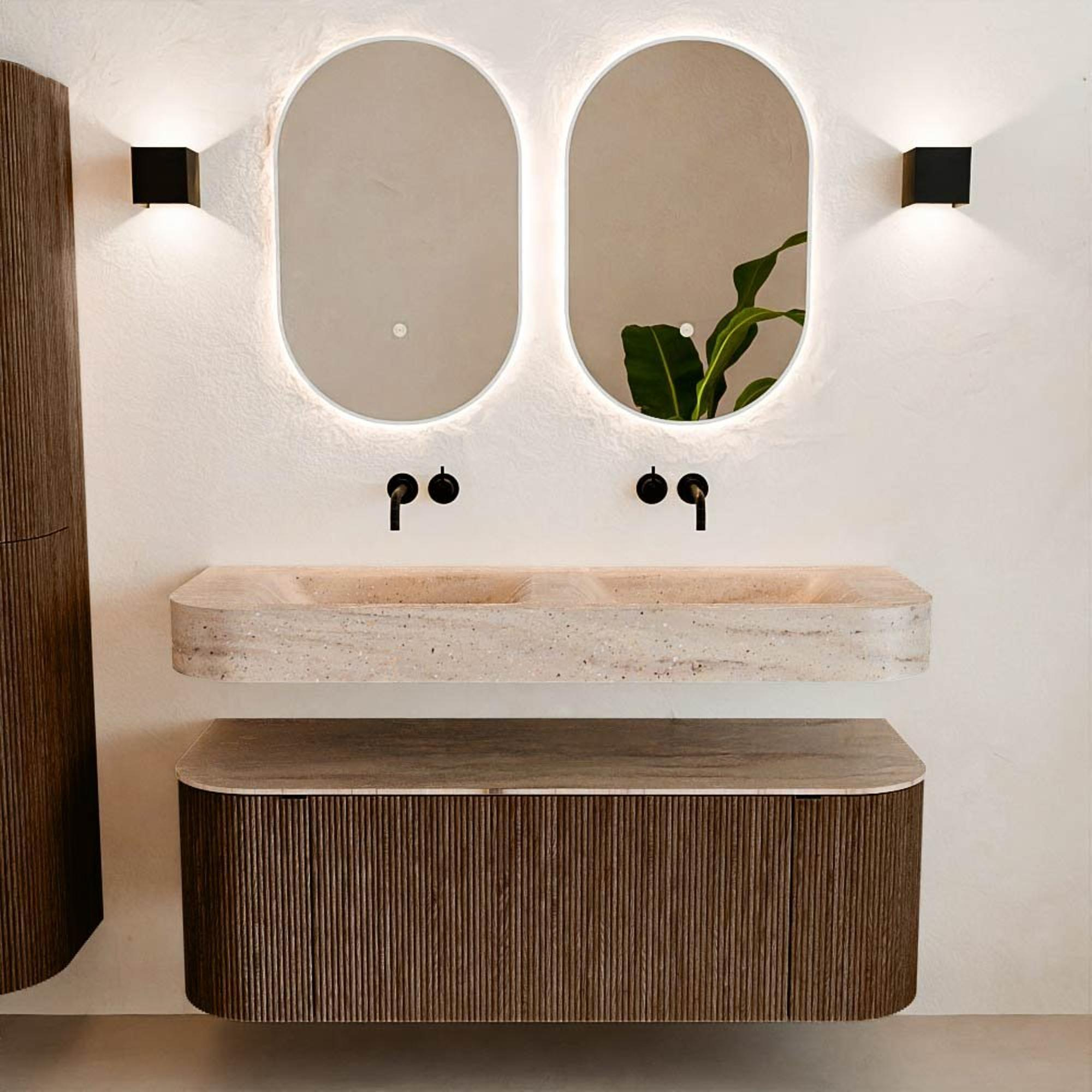 Natuurlijke materialen in warme tinten. De verticale ribbels brengen ritme en textuur in het ontwerp, terwijl het eikenhout zorgt voor een warme, ambachtelijke uitstraling. Kies uit 5 houttinten OAK, WALNUT, DUSK, SHADOW en RUBY zorgvuldig geselecteerde houtkleuren om zowel moderne als klassieke badkamers te verrijken.