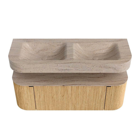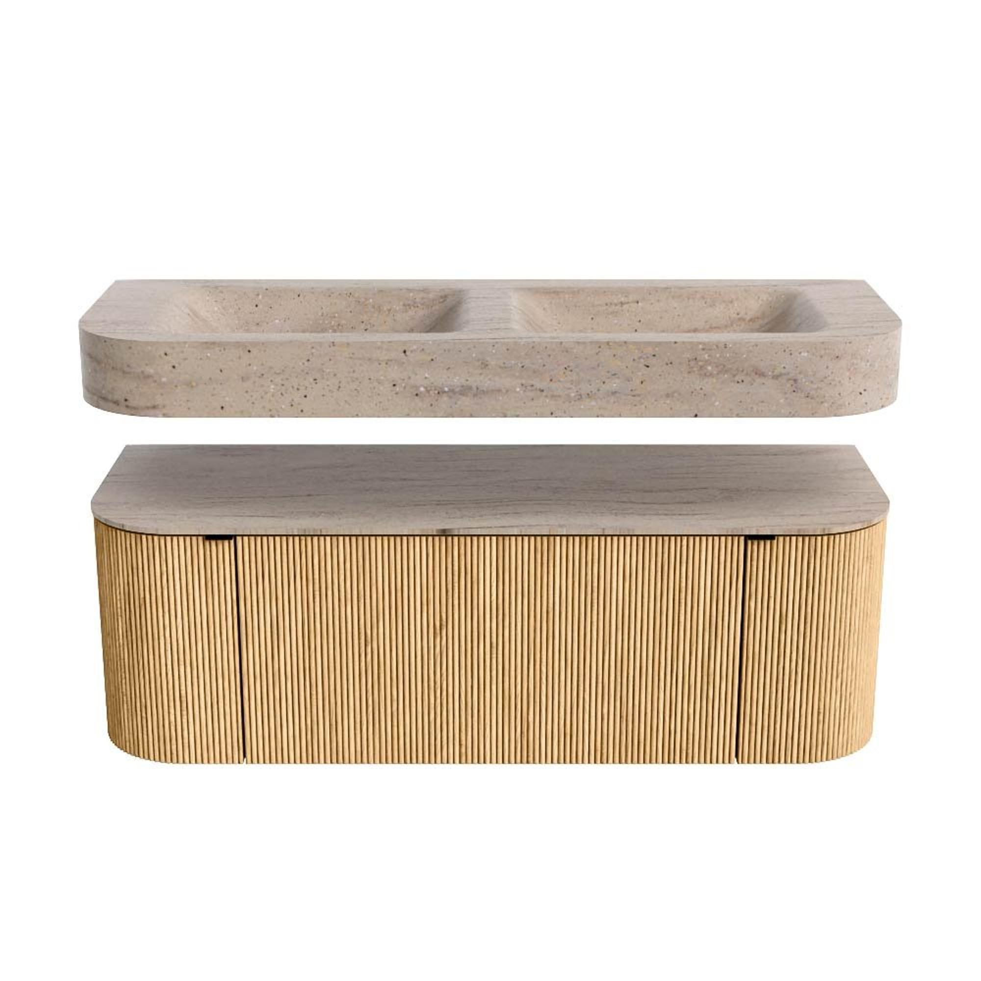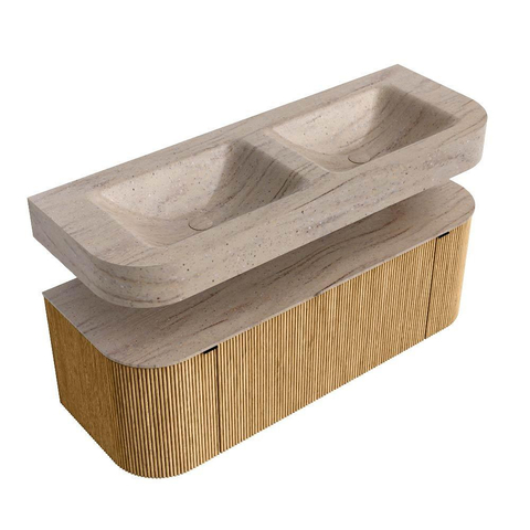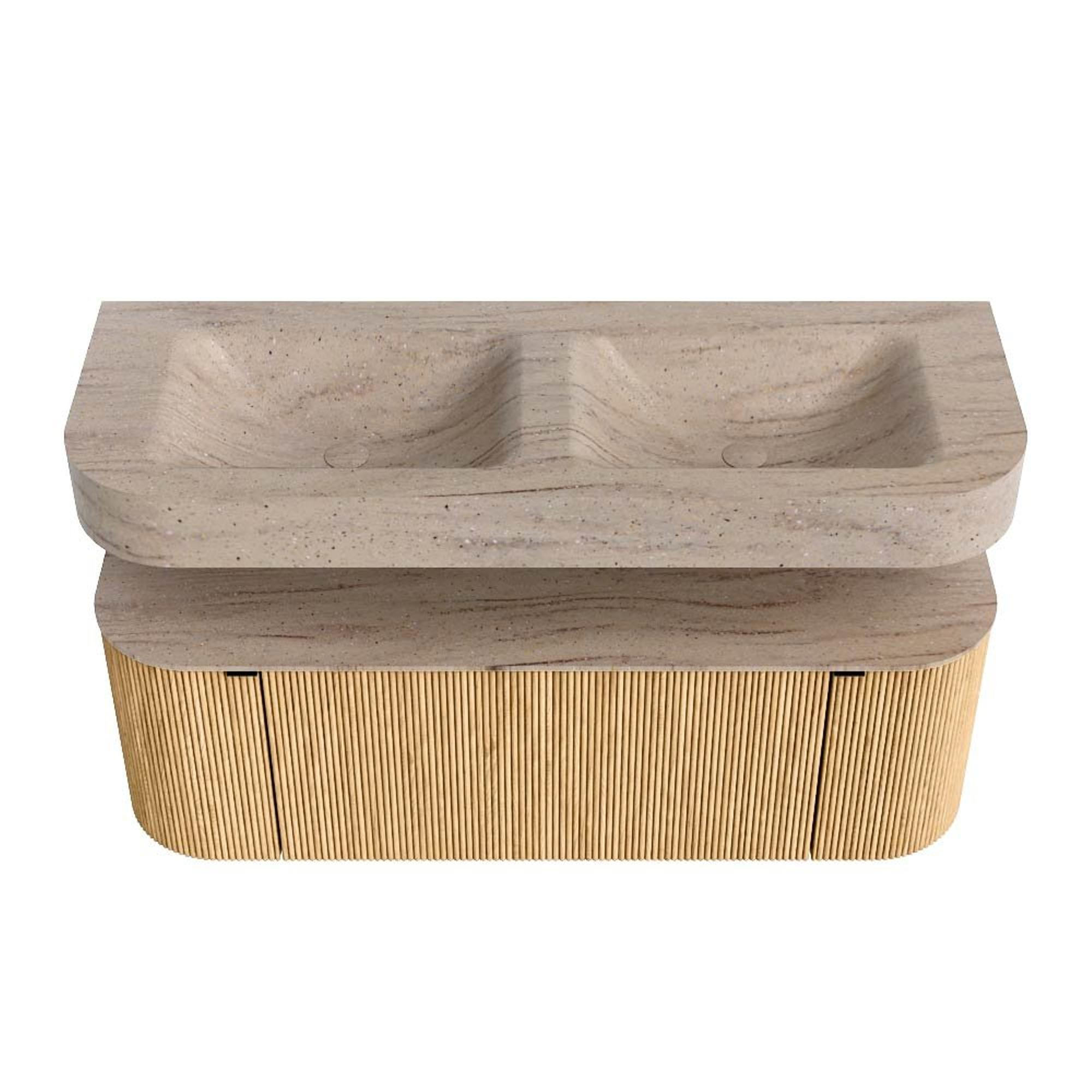MONDIAZ THOR-DLUX 130cm badmeubel ronding links + rechts kleur Oak met 1 lade en 2 deuren. Vrijhangende wastafel CLOUD Dubbel zonder kraangat kleur Saba.