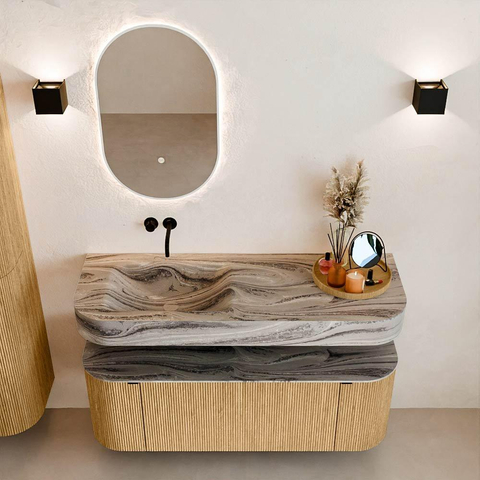 MONDIAZ THOR-DLUX 130cm badmeubel ronding links + rechts kleur Oak met 1 lade en 2 deuren. Vrijhangende wastafel CLOUD Links zonder kraangat kleur Sombra.