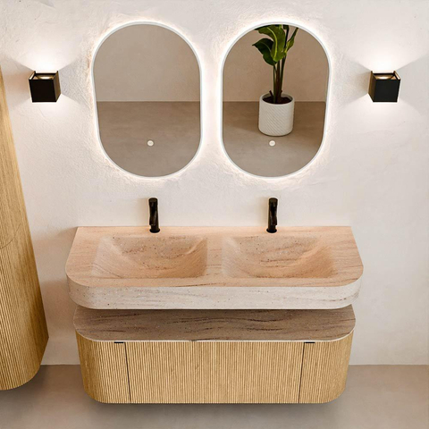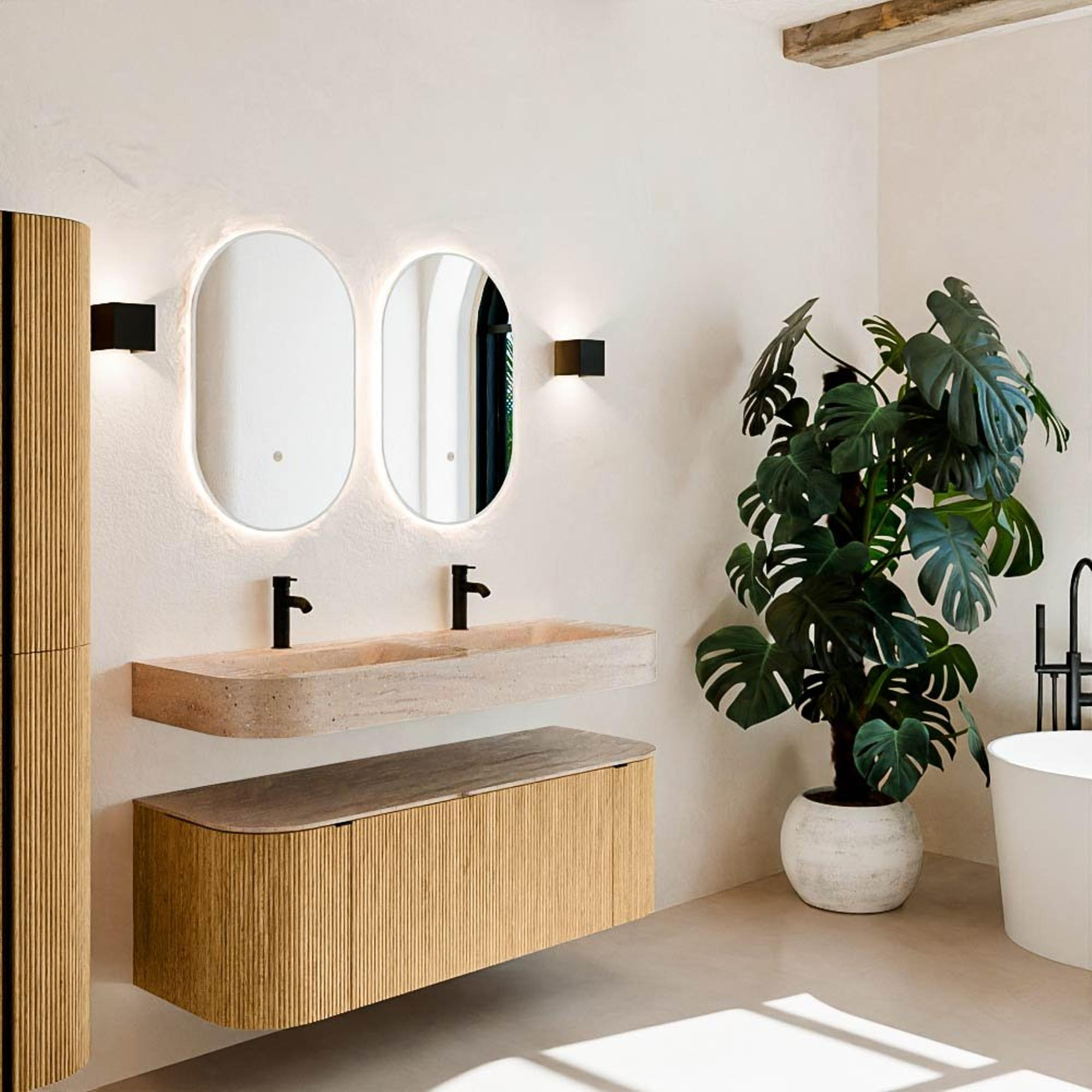 Natuurlijke materialen in warme tinten. De verticale ribbels brengen ritme en textuur in het ontwerp, terwijl het eikenhout zorgt voor een warme, ambachtelijke uitstraling. Kies uit 5 houttinten OAK, WALNUT, DUSK, SHADOW en RUBY zorgvuldig geselecteerde houtkleuren om zowel moderne als klassieke badkamers te verrijken.