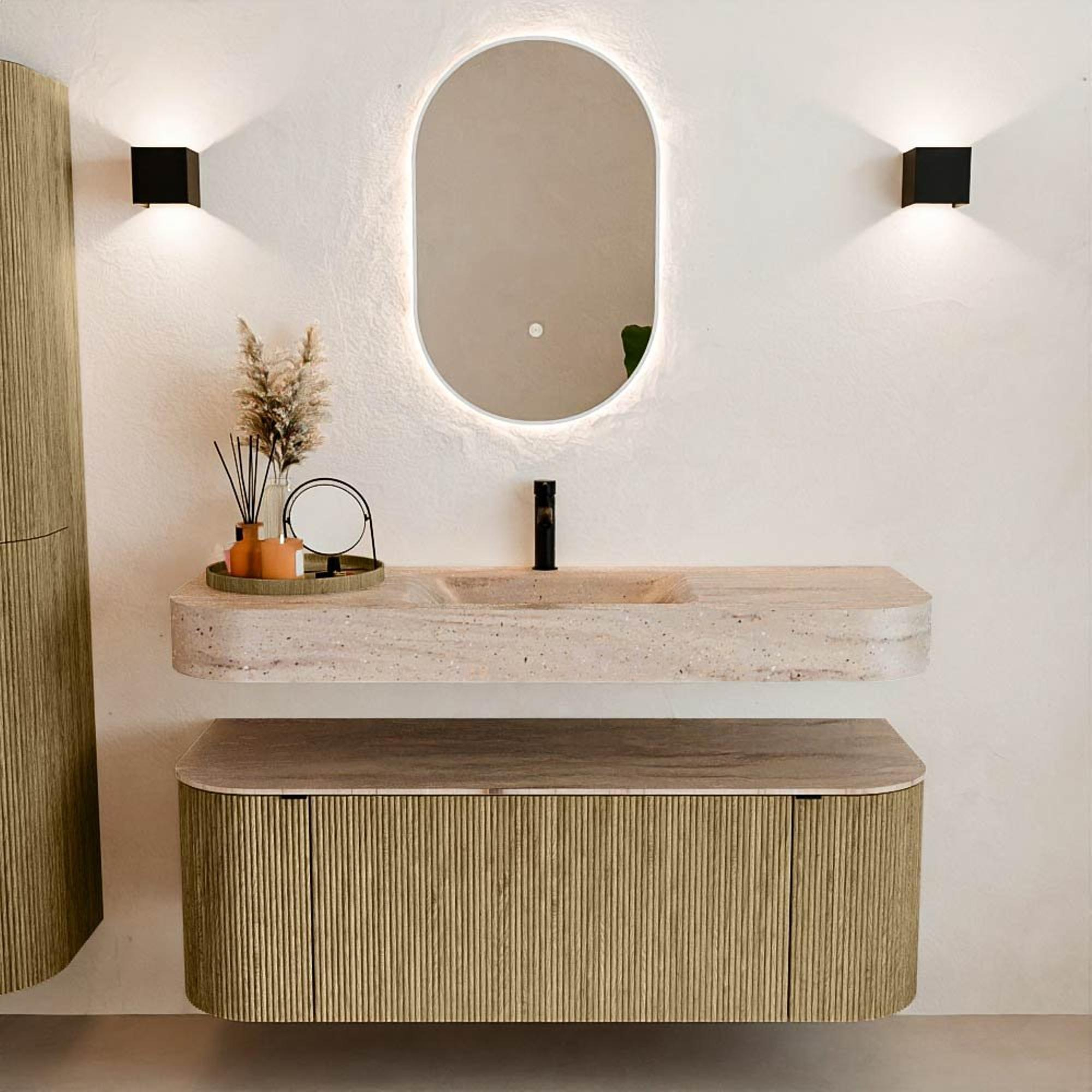Natuurlijke materialen in warme tinten. De verticale ribbels brengen ritme en textuur in het ontwerp, terwijl het eikenhout zorgt voor een warme, ambachtelijke uitstraling. Kies uit 5 houttinten OAK, WALNUT, DUSK, SHADOW en RUBY zorgvuldig geselecteerde houtkleuren om zowel moderne als klassieke badkamers te verrijken.