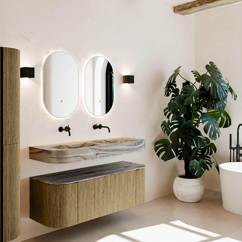 Natuurlijke materialen in warme tinten. De verticale ribbels brengen ritme en textuur in het ontwerp, terwijl het eikenhout zorgt voor een warme, ambachtelijke uitstraling. Kies uit 5 houttinten OAK, WALNUT, DUSK, SHADOW en RUBY zorgvuldig geselecteerde houtkleuren om zowel moderne als klassieke badkamers te verrijken.