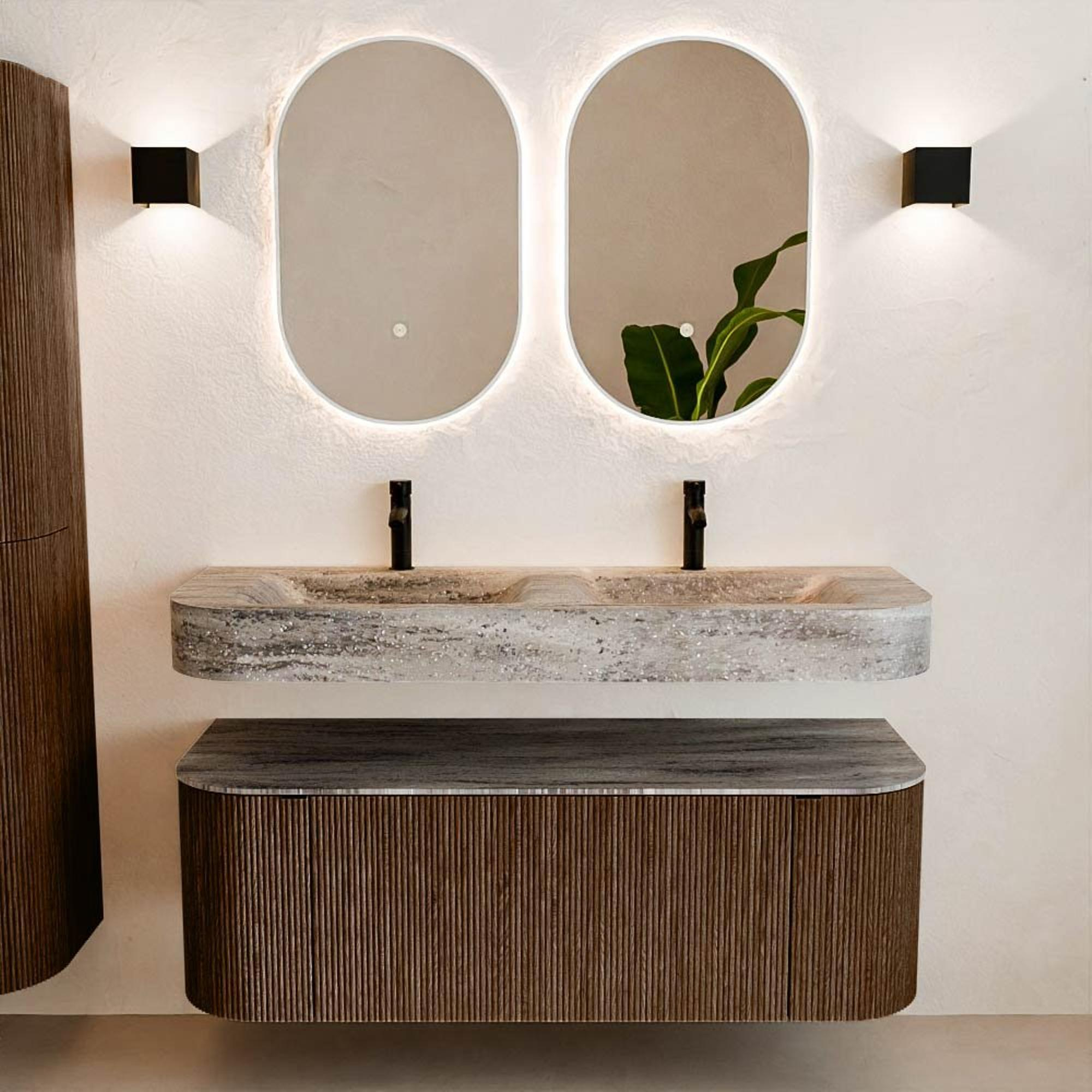 Natuurlijke materialen in warme tinten. De verticale ribbels brengen ritme en textuur in het ontwerp, terwijl het eikenhout zorgt voor een warme, ambachtelijke uitstraling. Kies uit 5 houttinten OAK, WALNUT, DUSK, SHADOW en RUBY zorgvuldig geselecteerde houtkleuren om zowel moderne als klassieke badkamers te verrijken.