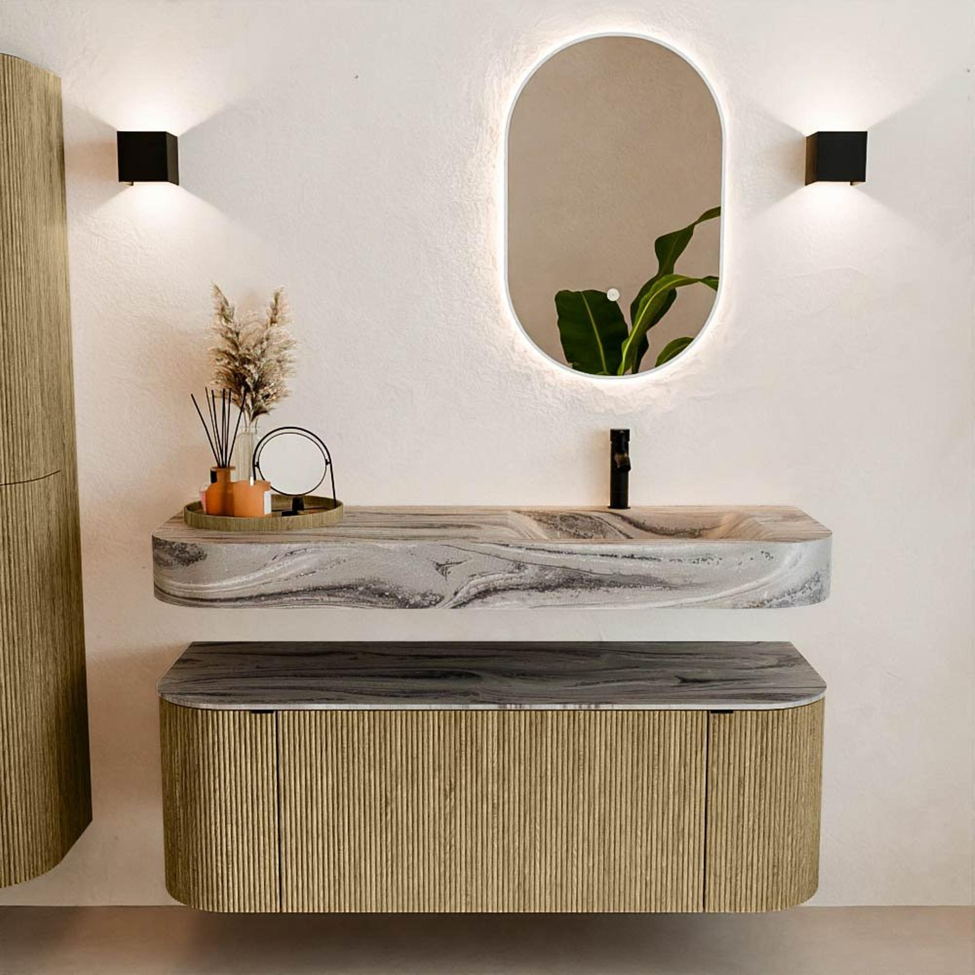 Natuurlijke materialen in warme tinten. De verticale ribbels brengen ritme en textuur in het ontwerp, terwijl het eikenhout zorgt voor een warme, ambachtelijke uitstraling. Kies uit 5 houttinten OAK, WALNUT, DUSK, SHADOW en RUBY zorgvuldig geselecteerde houtkleuren om zowel moderne als klassieke badkamers te verrijken.