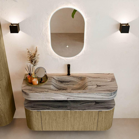 MONDIAZ THOR-DLUX 130cm badmeubel ronding links + rechts kleur Dusk met 1 lade en 2 deuren. Vrijhangende wastafel CLOUD Midden 1 kraangat kleur Sombra.
