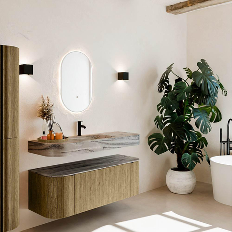 Natuurlijke materialen in warme tinten. De verticale ribbels brengen ritme en textuur in het ontwerp, terwijl het eikenhout zorgt voor een warme, ambachtelijke uitstraling. Kies uit 5 houttinten OAK, WALNUT, DUSK, SHADOW en RUBY zorgvuldig geselecteerde houtkleuren om zowel moderne als klassieke badkamers te verrijken.