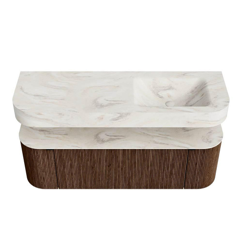 MONDIAZ THOR-DLUX 140cm badmeubel ronding links + rechts kleur Walnut met 1 lade en 2 deuren. Vrijhangende wastafel CLOUD Rechts zonder kraangat kleur Ostra.