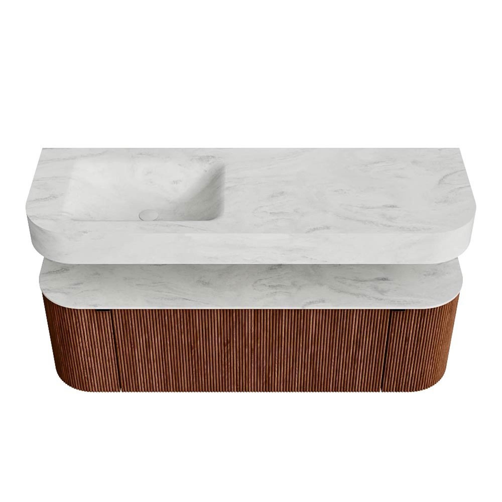 Boven het meubel zweeft een bijpassende, vrij hangende wastafel met afgeronde hoeken – perfect afgestemd op de vorm van de kast. De wastafel is uitgevoerd in Solid Surface en volgt subtiel de lijnen van het onderliggende meubel, waardoor een harmonieus geheel ontstaat. Het Solid Surface topblad vormt een sterke, onderhoudsvriendelijke basis en maakt de combinatie compleet.