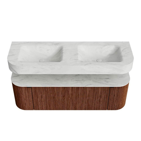 MONDIAZ THOR-DLUX 140cm badmeubel ronding links + rechts kleur Ruby met 1 lade en 2 deuren. Vrijhangende wastafel CLOUD Dubbel 2 kraangaten kleur Opalo.