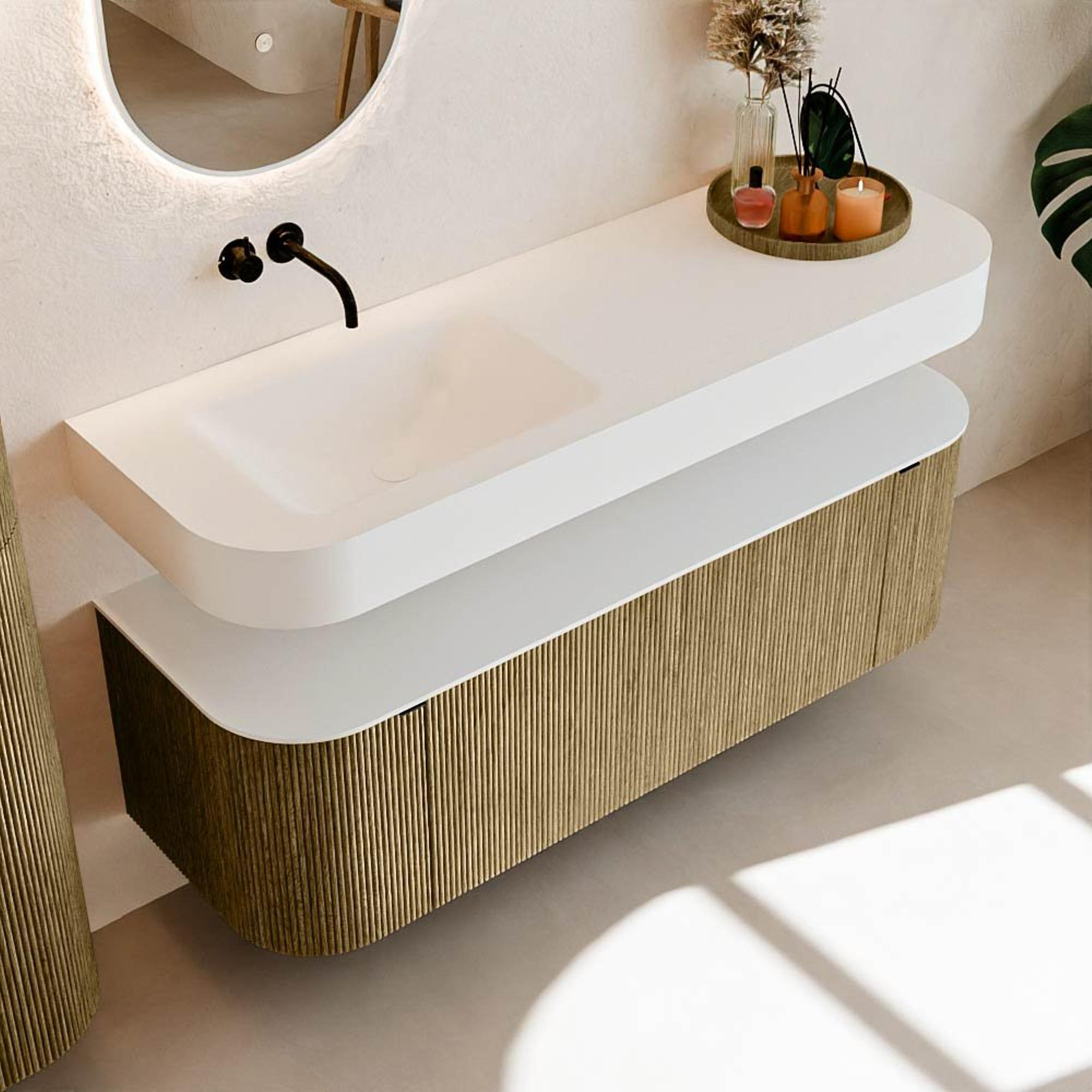 Boven het meubel zweeft een bijpassende, vrij hangende wastafel met afgeronde hoeken – perfect afgestemd op de vorm van de kast. De wastafel is uitgevoerd in Solid Surface en volgt subtiel de lijnen van het onderliggende meubel, waardoor een harmonieus geheel ontstaat. Het Solid Surface topblad vormt een sterke, onderhoudsvriendelijke basis en maakt de combinatie compleet.
