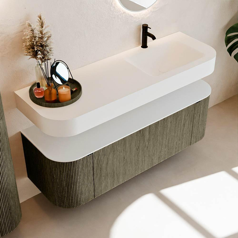 Boven het meubel zweeft een bijpassende, vrij hangende wastafel met afgeronde hoeken – perfect afgestemd op de vorm van de kast. De wastafel is uitgevoerd in Solid Surface en volgt subtiel de lijnen van het onderliggende meubel, waardoor een harmonieus geheel ontstaat. Het Solid Surface topblad vormt een sterke, onderhoudsvriendelijke basis en maakt de combinatie compleet.