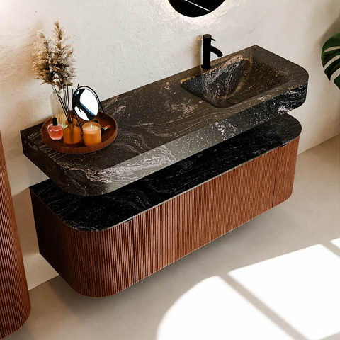 MONDIAZ THOR-DLUX 140cm badmeubel ronding links + rechts kleur Ruby met 1 lade en 2 deuren. Vrijhangende wastafel CLOUD Rechts 1 kraangat kleur Lava.