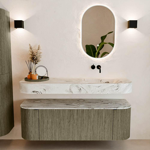 Boven het meubel zweeft een bijpassende, vrij hangende wastafel met afgeronde hoeken – perfect afgestemd op de vorm van de kast. De wastafel is uitgevoerd in Solid Surface en volgt subtiel de lijnen van het onderliggende meubel, waardoor een harmonieus geheel ontstaat. Het Solid Surface topblad vormt een sterke, onderhoudsvriendelijke basis en maakt de combinatie compleet.