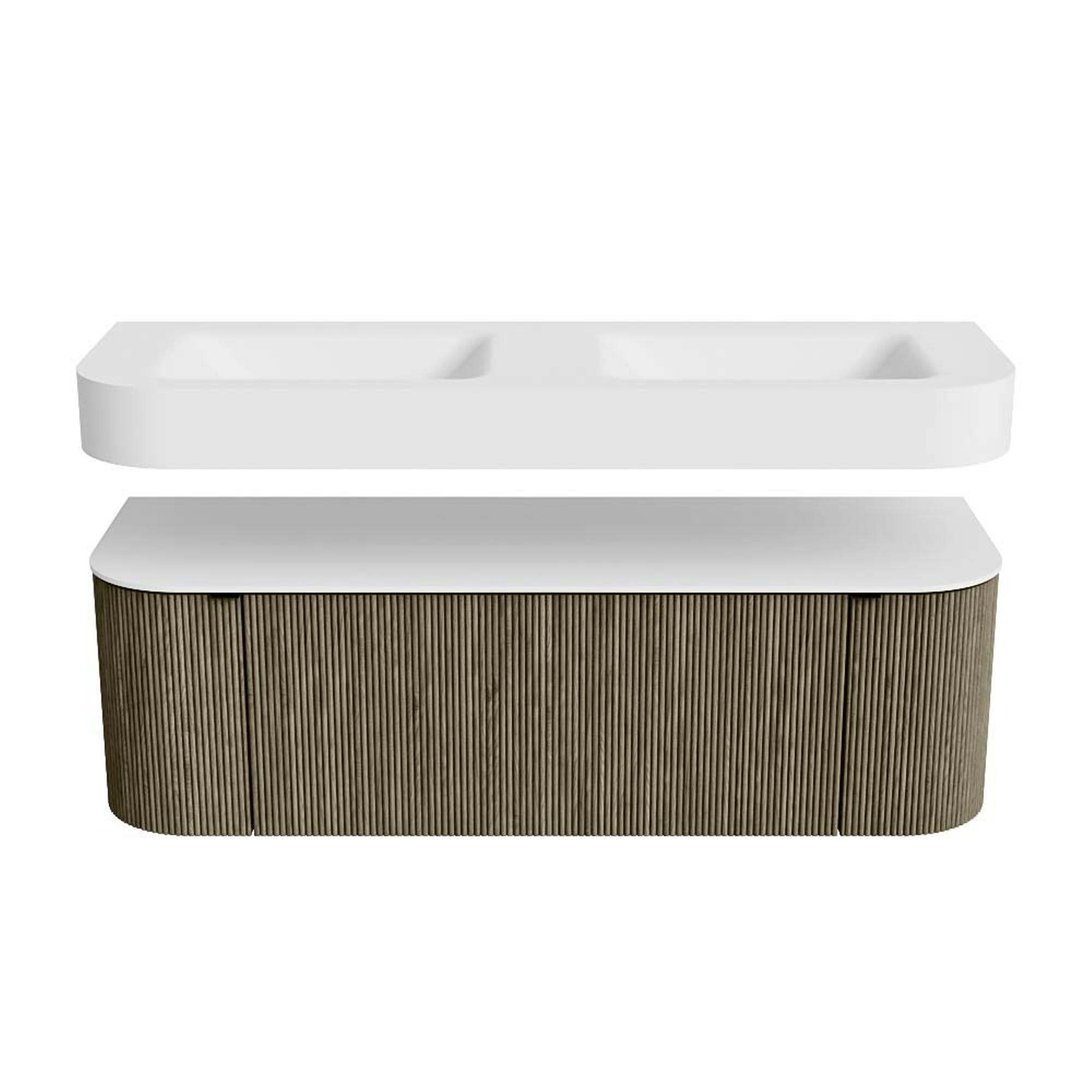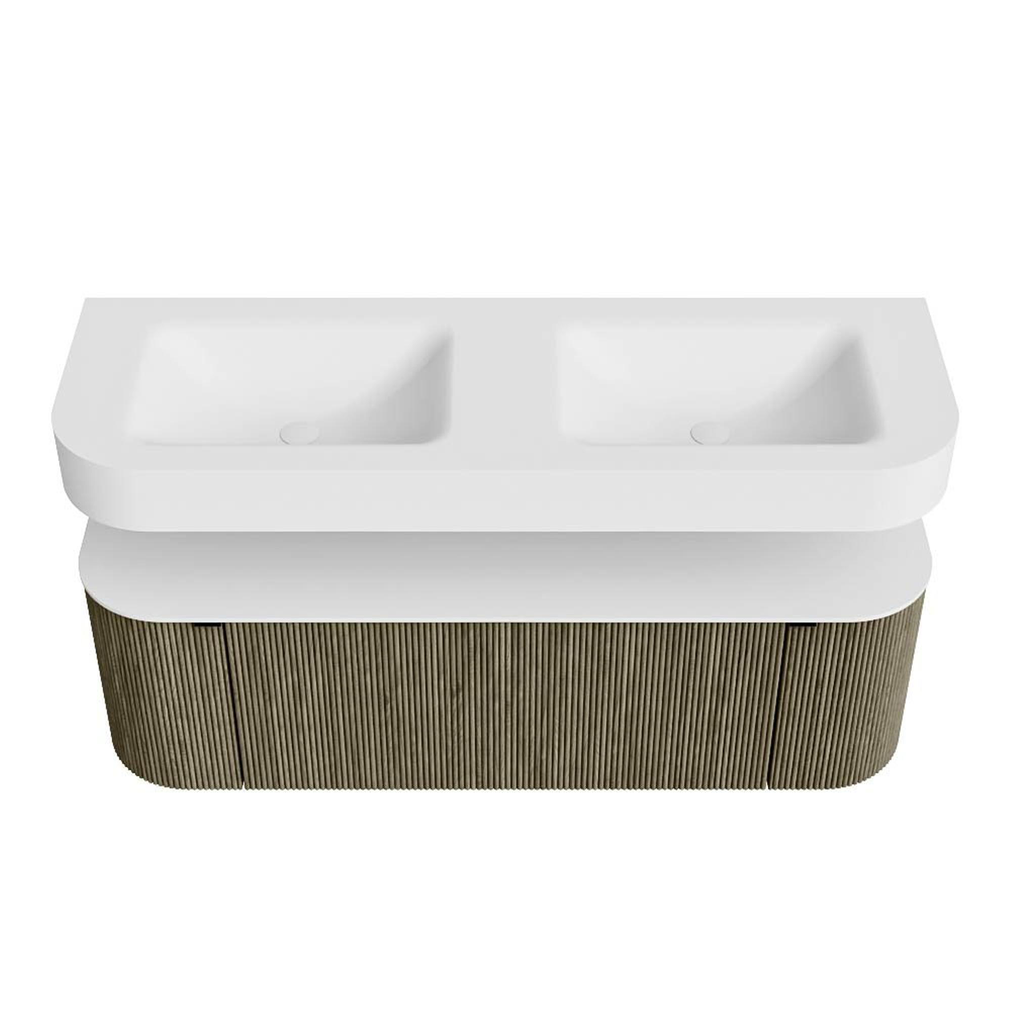 Boven het meubel zweeft een bijpassende, vrij hangende wastafel met afgeronde hoeken – perfect afgestemd op de vorm van de kast. De wastafel is uitgevoerd in Solid Surface en volgt subtiel de lijnen van het onderliggende meubel, waardoor een harmonieus geheel ontstaat. Het Solid Surface topblad vormt een sterke, onderhoudsvriendelijke basis en maakt de combinatie compleet.
