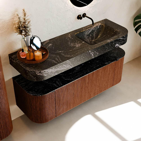 MONDIAZ THOR-DLUX 140cm badmeubel ronding links + rechts kleur Ruby met 1 lade en 2 deuren. Vrijhangende wastafel CLOUD Rechts zonder kraangat kleur Lava.