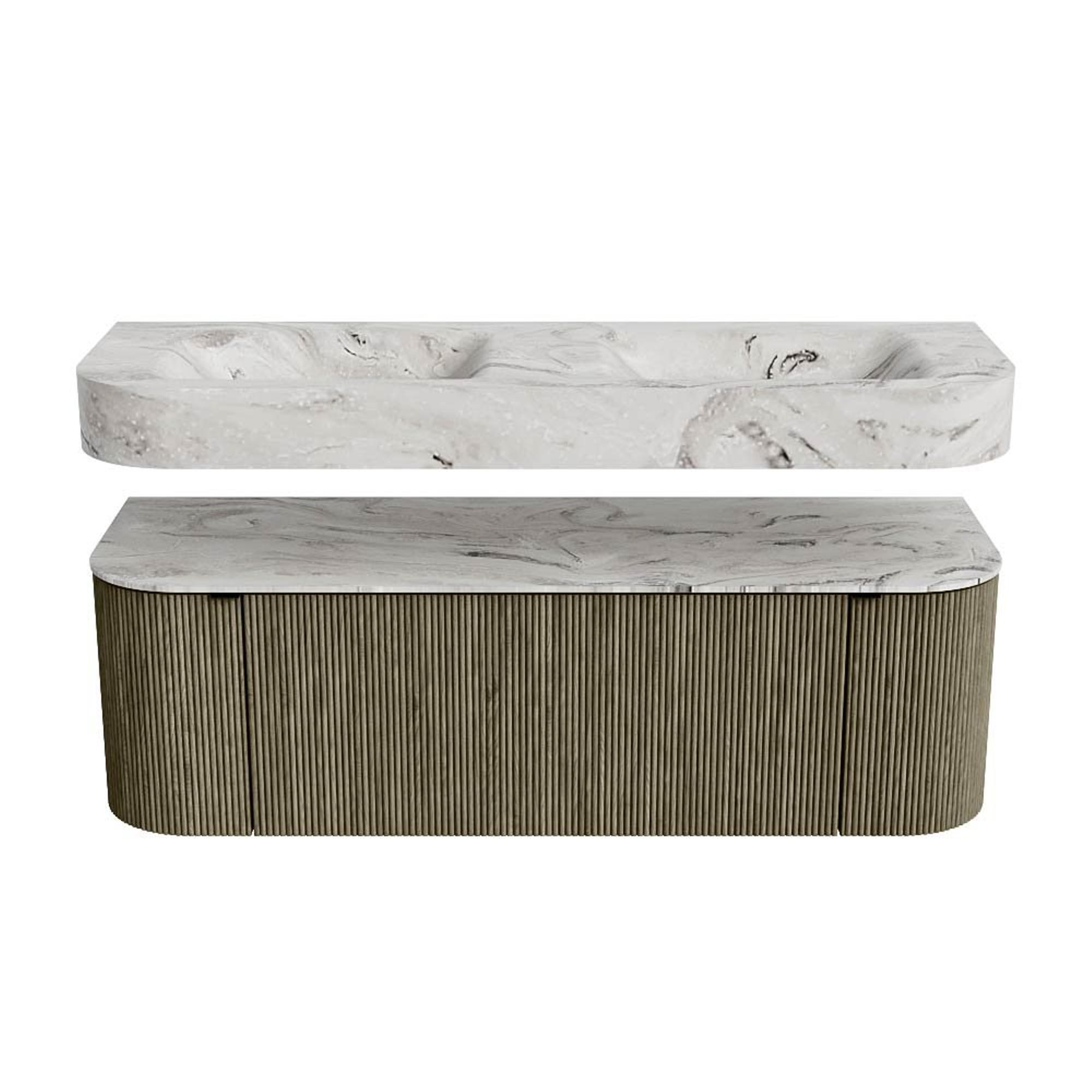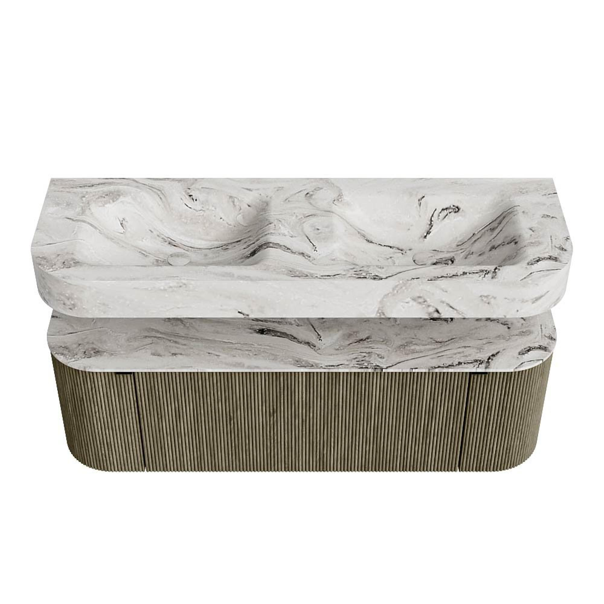 MONDIAZ THOR-DLUX 140cm badmeubel ronding links + rechts kleur Shadow met 1 lade en 2 deuren. Vrijhangende wastafel CLOUD Dubbel zonder kraangat kleur Glace.