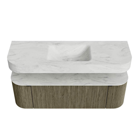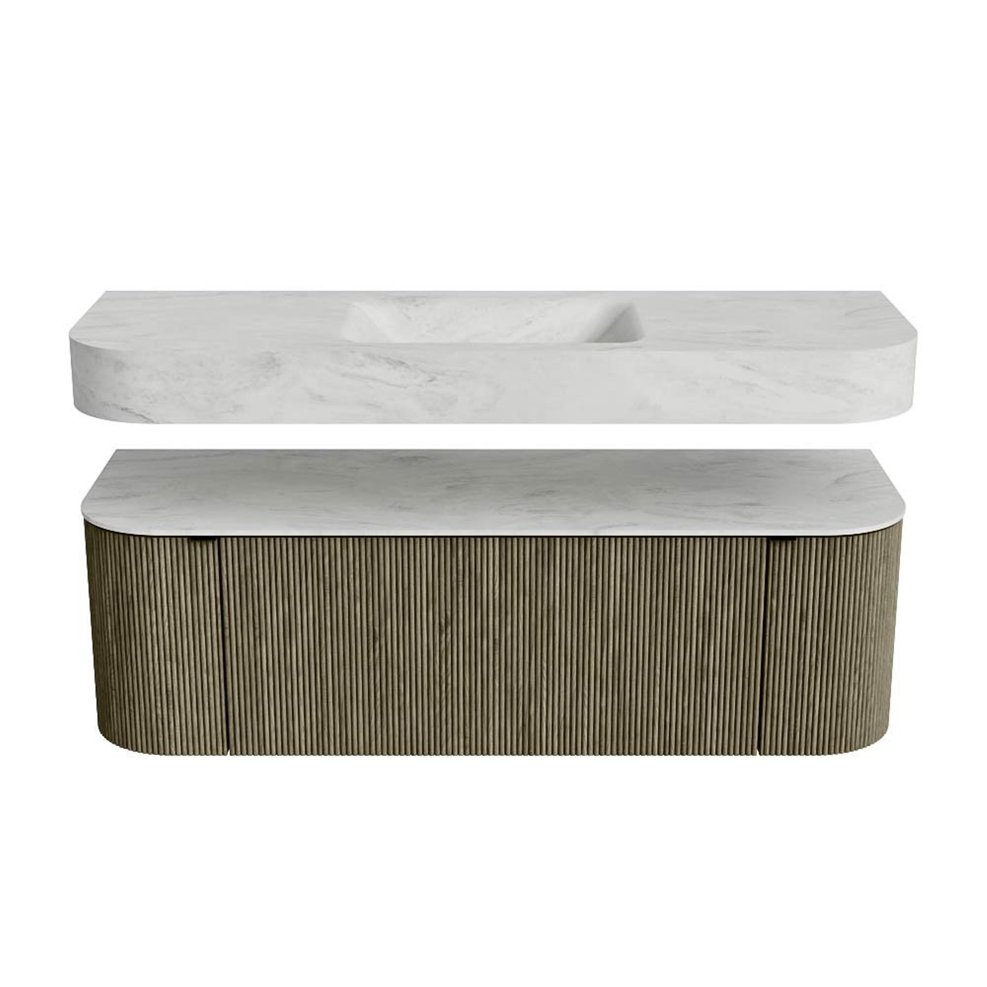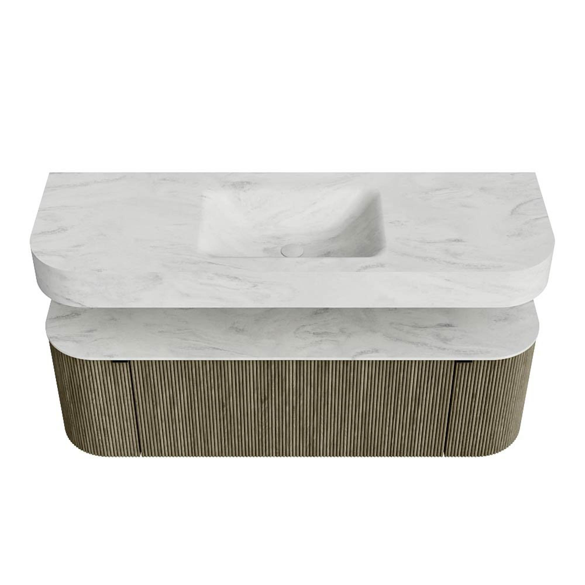 Boven het meubel zweeft een bijpassende, vrij hangende wastafel met afgeronde hoeken – perfect afgestemd op de vorm van de kast. De wastafel is uitgevoerd in Solid Surface en volgt subtiel de lijnen van het onderliggende meubel, waardoor een harmonieus geheel ontstaat. Het Solid Surface topblad vormt een sterke, onderhoudsvriendelijke basis en maakt de combinatie compleet.