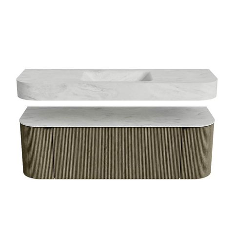 MONDIAZ THOR-DLUX 140cm badmeubel ronding links + rechts kleur Shadow met 1 lade en 2 deuren. Vrijhangende wastafel CLOUD Midden zonder kraangat kleur Opalo.
