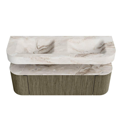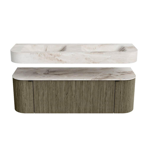 MONDIAZ THOR-DLUX 140cm badmeubel ronding links + rechts kleur Shadow met 1 lade en 2 deuren. Vrijhangende wastafel CLOUD Dubbel zonder kraangat kleur Frappe.