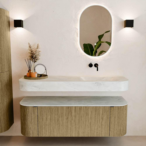 Boven het meubel zweeft een bijpassende, vrij hangende wastafel met afgeronde hoeken – perfect afgestemd op de vorm van de kast. De wastafel is uitgevoerd in Solid Surface en volgt subtiel de lijnen van het onderliggende meubel, waardoor een harmonieus geheel ontstaat. Het Solid Surface topblad vormt een sterke, onderhoudsvriendelijke basis en maakt de combinatie compleet.