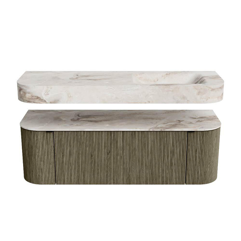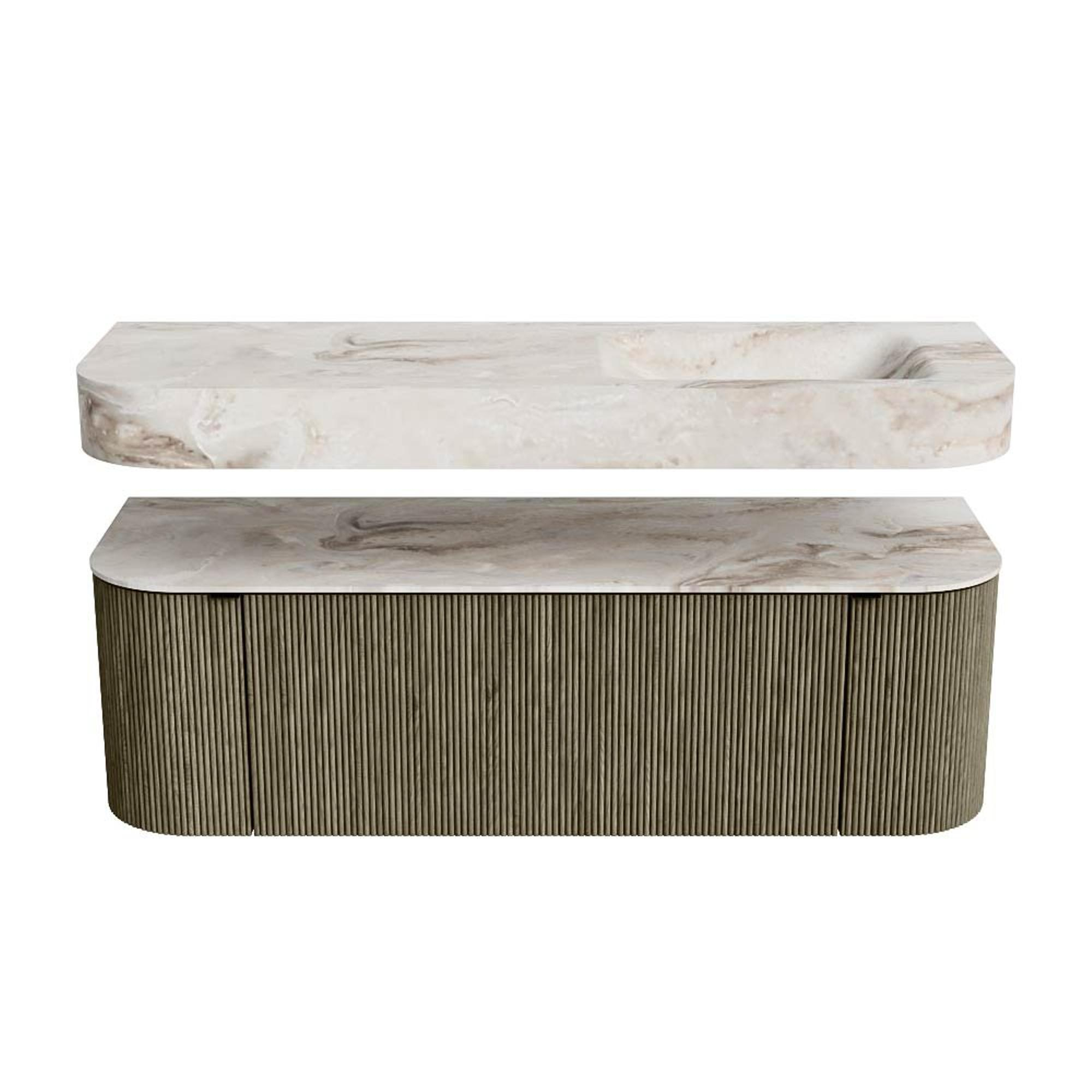 MONDIAZ THOR-DLUX 140cm badmeubel ronding links + rechts kleur Shadow met 1 lade en 2 deuren. Vrijhangende wastafel CLOUD Rechts 1 kraangat kleur Frappe.
