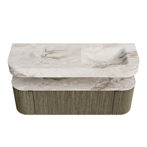 Boven het meubel zweeft een bijpassende, vrij hangende wastafel met afgeronde hoeken – perfect afgestemd op de vorm van de kast. De wastafel is uitgevoerd in Solid Surface en volgt subtiel de lijnen van het onderliggende meubel, waardoor een harmonieus geheel ontstaat. Het Solid Surface topblad vormt een sterke, onderhoudsvriendelijke basis en maakt de combinatie compleet.