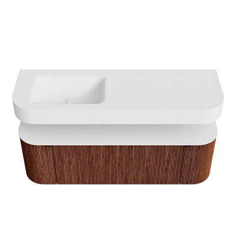 Boven het meubel zweeft een bijpassende, vrij hangende wastafel met afgeronde hoeken – perfect afgestemd op de vorm van de kast. De wastafel is uitgevoerd in Solid Surface en volgt subtiel de lijnen van het onderliggende meubel, waardoor een harmonieus geheel ontstaat. Het Solid Surface topblad vormt een sterke, onderhoudsvriendelijke basis en maakt de combinatie compleet.
