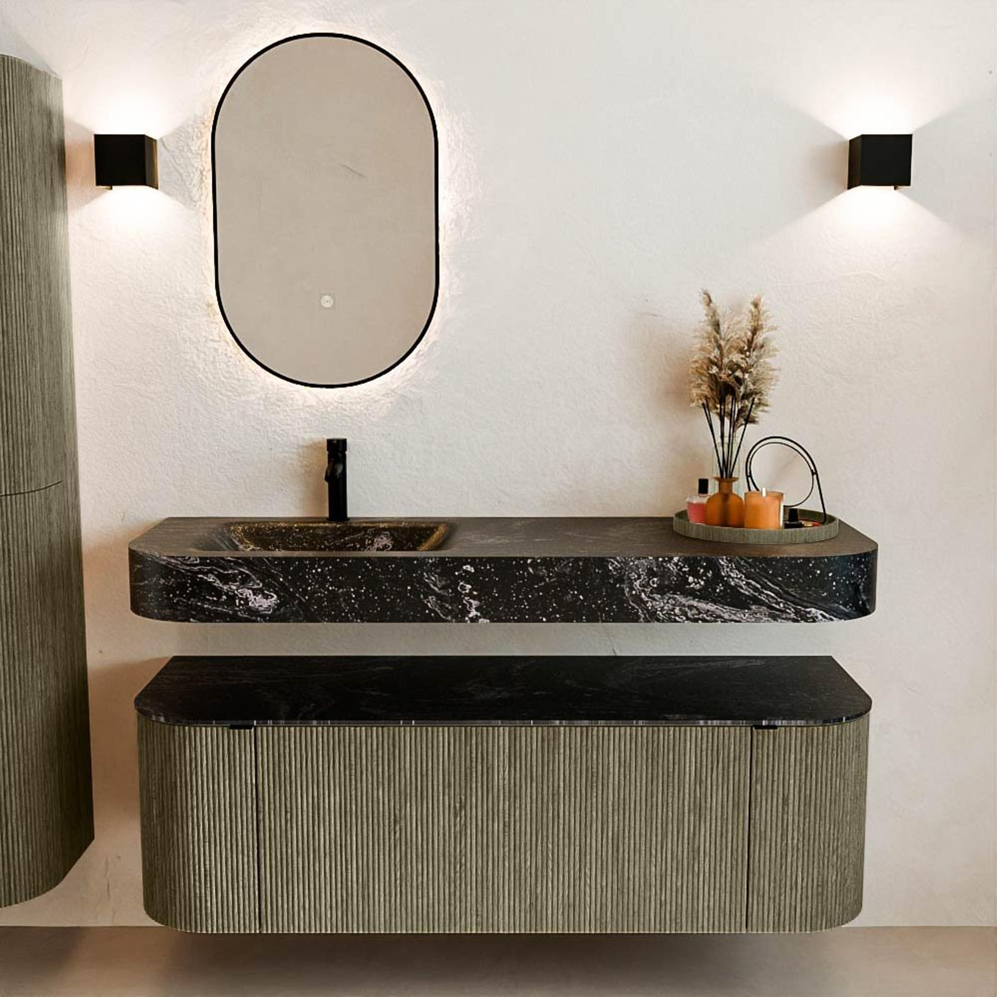 MONDIAZ THOR-DLUX 140cm badmeubel ronding links + rechts kleur Shadow met 1 lade en 2 deuren. Vrijhangende wastafel CLOUD Links 1 kraangat kleur Lava.