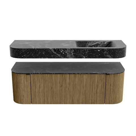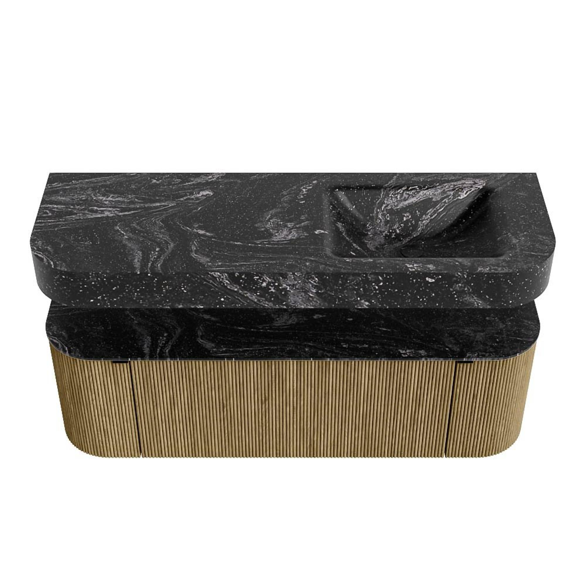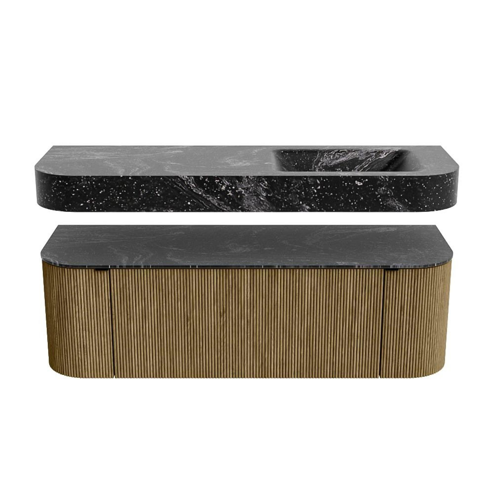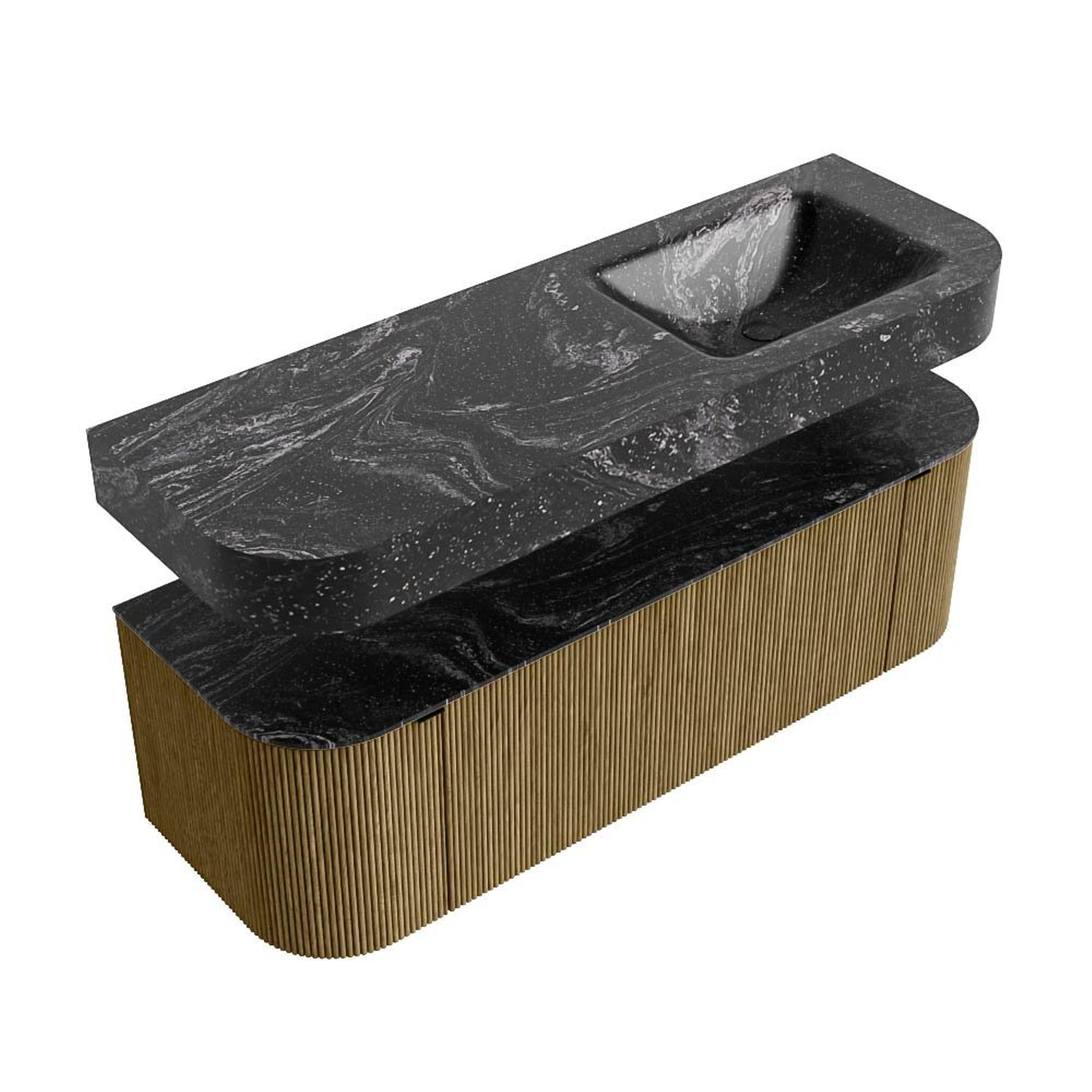 MONDIAZ THOR-DLUX 140cm badmeubel ronding links + rechts kleur Dusk met 1 lade en 2 deuren. Vrijhangende wastafel CLOUD Rechts zonder kraangat kleur Lava.