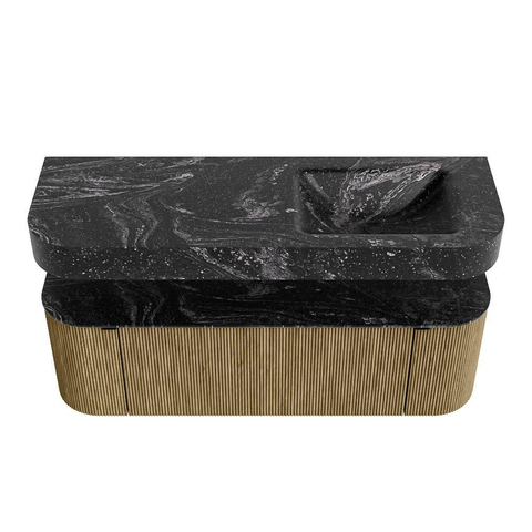 Boven het meubel zweeft een bijpassende, vrij hangende wastafel met afgeronde hoeken – perfect afgestemd op de vorm van de kast. De wastafel is uitgevoerd in Solid Surface en volgt subtiel de lijnen van het onderliggende meubel, waardoor een harmonieus geheel ontstaat. Het Solid Surface topblad vormt een sterke, onderhoudsvriendelijke basis en maakt de combinatie compleet.