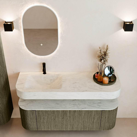 Boven het meubel zweeft een bijpassende, vrij hangende wastafel met afgeronde hoeken – perfect afgestemd op de vorm van de kast. De wastafel is uitgevoerd in Solid Surface en volgt subtiel de lijnen van het onderliggende meubel, waardoor een harmonieus geheel ontstaat. Het Solid Surface topblad vormt een sterke, onderhoudsvriendelijke basis en maakt de combinatie compleet.