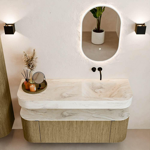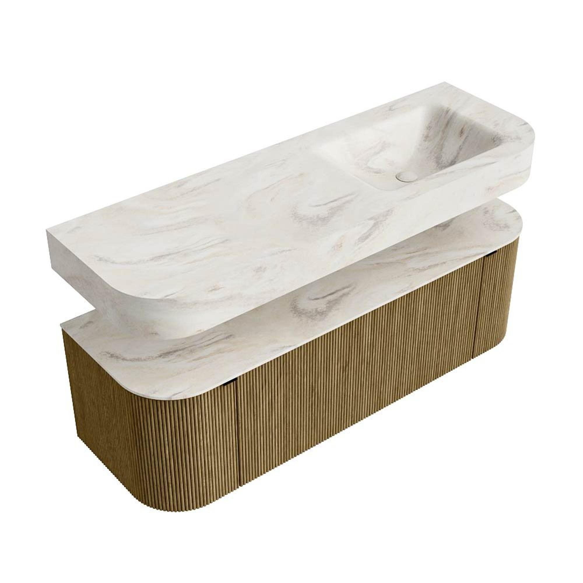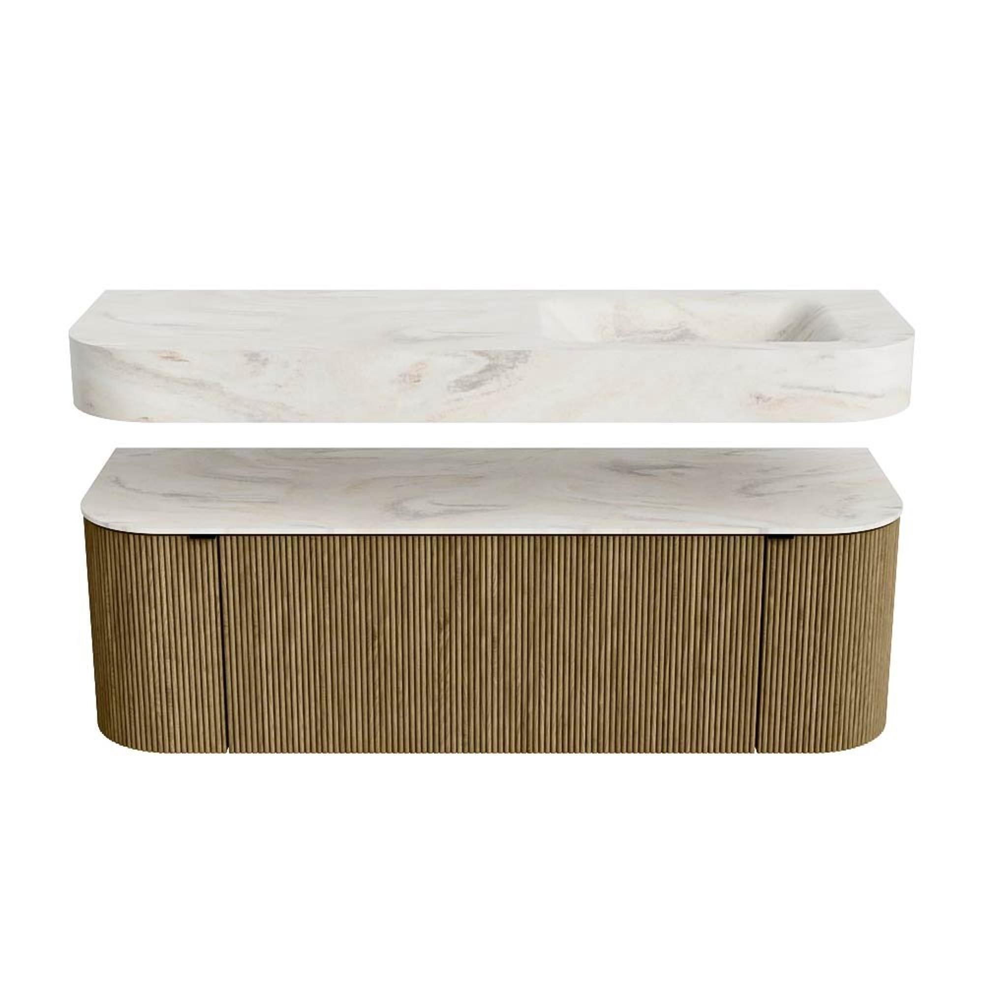 Boven het meubel zweeft een bijpassende, vrij hangende wastafel met afgeronde hoeken – perfect afgestemd op de vorm van de kast. De wastafel is uitgevoerd in Solid Surface en volgt subtiel de lijnen van het onderliggende meubel, waardoor een harmonieus geheel ontstaat. Het Solid Surface topblad vormt een sterke, onderhoudsvriendelijke basis en maakt de combinatie compleet.