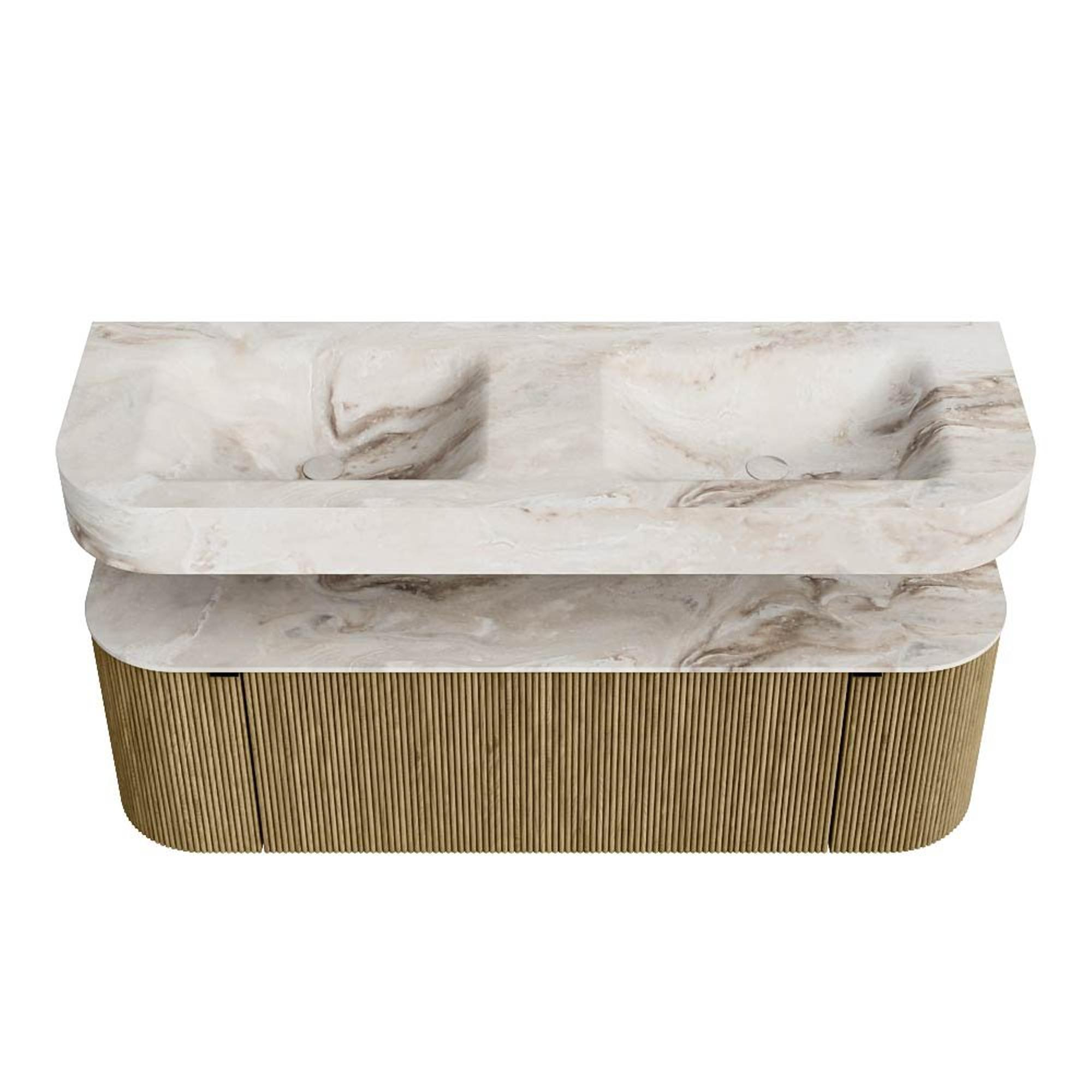 MONDIAZ THOR-DLUX 140cm badmeubel ronding links + rechts kleur Dusk met 1 lade en 2 deuren. Vrijhangende wastafel CLOUD Dubbel 2 kraangaten kleur Frappe.