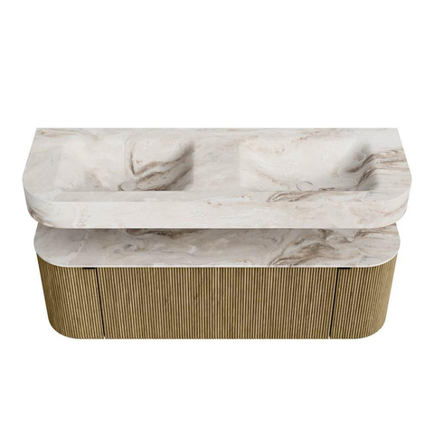 Boven het meubel zweeft een bijpassende, vrij hangende wastafel met afgeronde hoeken – perfect afgestemd op de vorm van de kast. De wastafel is uitgevoerd in Solid Surface en volgt subtiel de lijnen van het onderliggende meubel, waardoor een harmonieus geheel ontstaat. Het Solid Surface topblad vormt een sterke, onderhoudsvriendelijke basis en maakt de combinatie compleet.