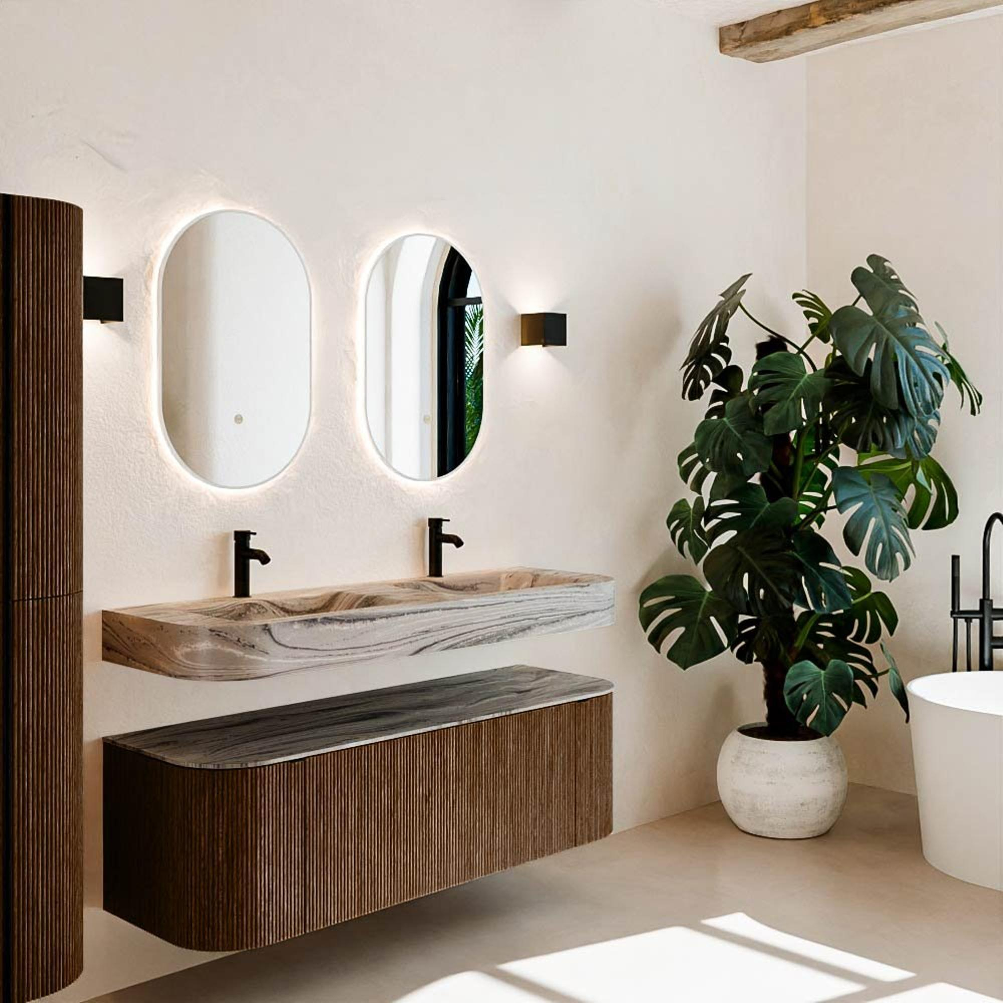 Natuurlijke materialen in warme tinten. De verticale ribbels brengen ritme en textuur in het ontwerp, terwijl het eikenhout zorgt voor een warme, ambachtelijke uitstraling. Kies uit 5 houttinten OAK, WALNUT, DUSK, SHADOW en RUBY zorgvuldig geselecteerde houtkleuren om zowel moderne als klassieke badkamers te verrijken.