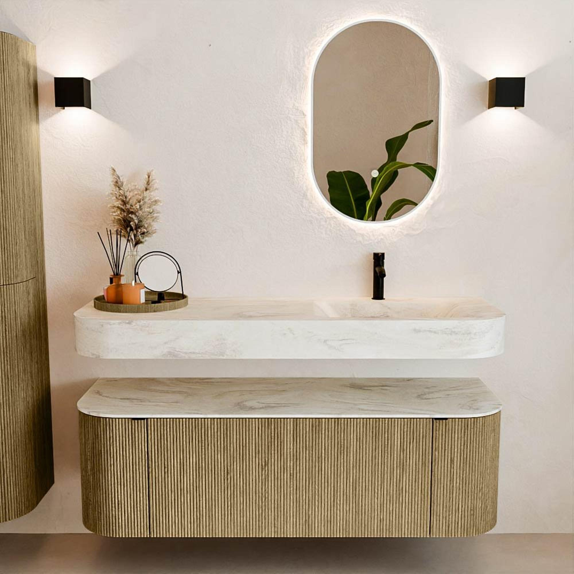 Natuurlijke materialen in warme tinten. De verticale ribbels brengen ritme en textuur in het ontwerp, terwijl het eikenhout zorgt voor een warme, ambachtelijke uitstraling. Kies uit 5 houttinten OAK, WALNUT, DUSK, SHADOW en RUBY zorgvuldig geselecteerde houtkleuren om zowel moderne als klassieke badkamers te verrijken.