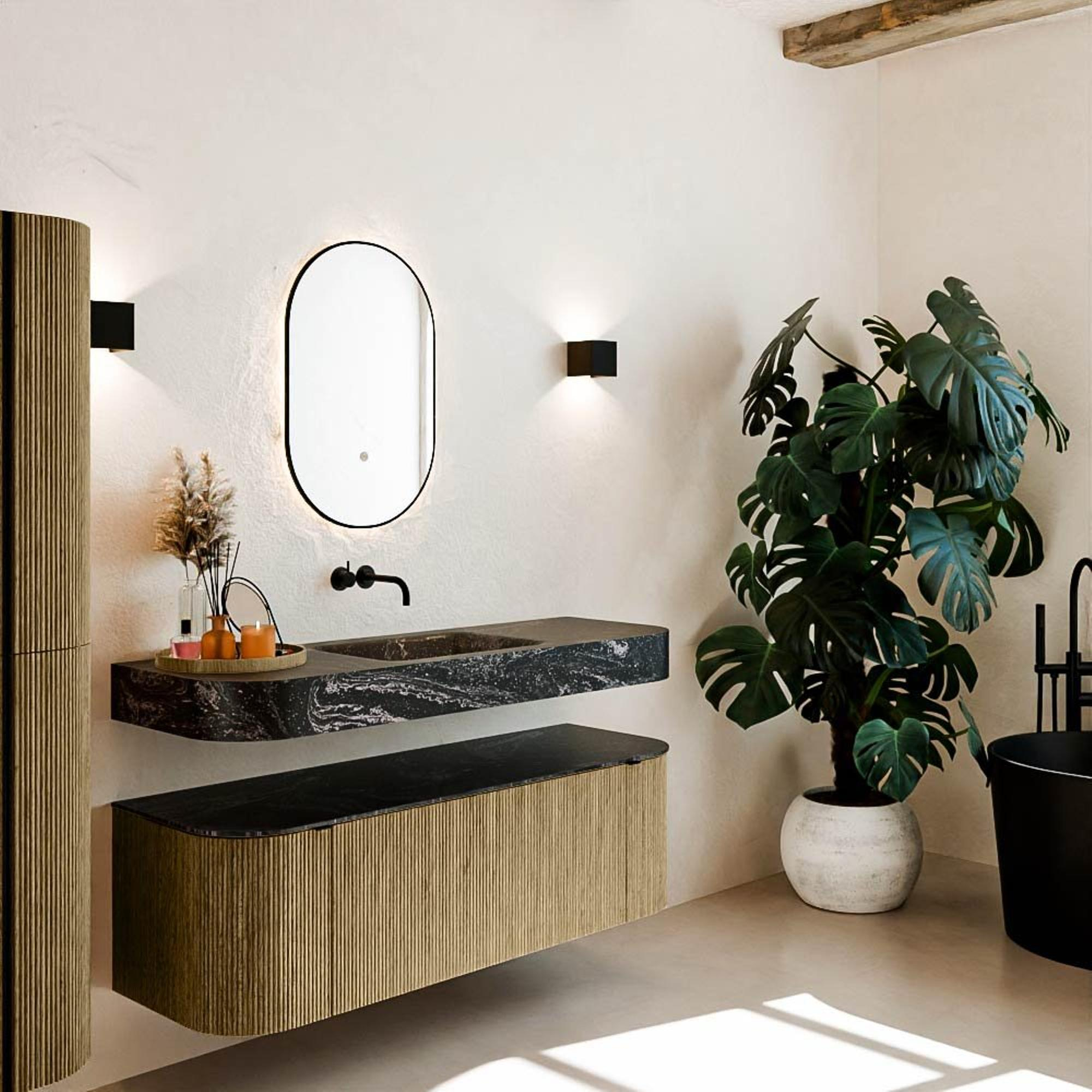 Natuurlijke materialen in warme tinten. De verticale ribbels brengen ritme en textuur in het ontwerp, terwijl het eikenhout zorgt voor een warme, ambachtelijke uitstraling. Kies uit 5 houttinten OAK, WALNUT, DUSK, SHADOW en RUBY zorgvuldig geselecteerde houtkleuren om zowel moderne als klassieke badkamers te verrijken.