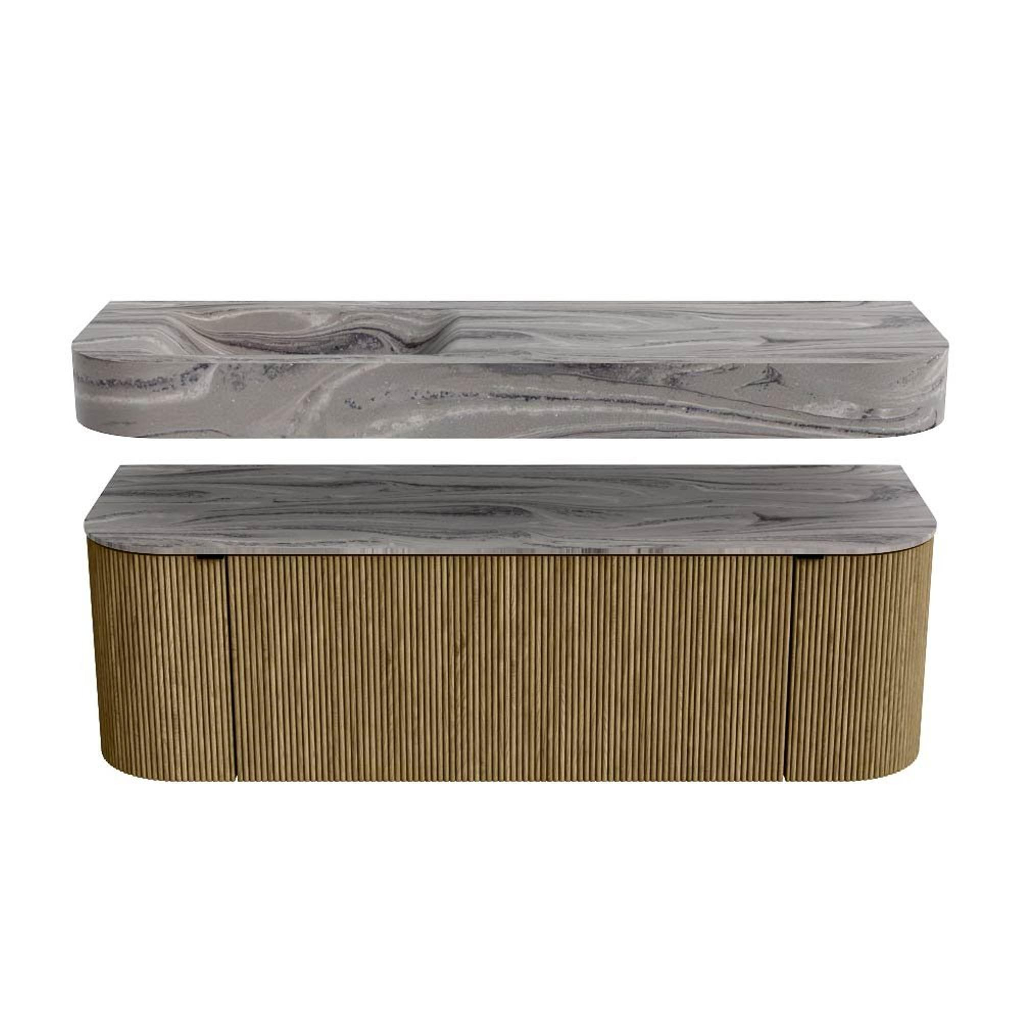 Boven het meubel zweeft een bijpassende, vrij hangende wastafel met afgeronde hoeken – perfect afgestemd op de vorm van de kast. De wastafel is uitgevoerd in Solid Surface en volgt subtiel de lijnen van het onderliggende meubel, waardoor een harmonieus geheel ontstaat. Het Solid Surface topblad vormt een sterke, onderhoudsvriendelijke basis en maakt de combinatie compleet.