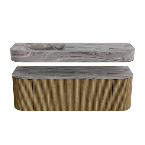 MONDIAZ THOR-DLUX 140cm badmeubel ronding links + rechts kleur Dusk met 1 lade en 2 deuren. Vrijhangende wastafel CLOUD Links 1 kraangat kleur Sombra.