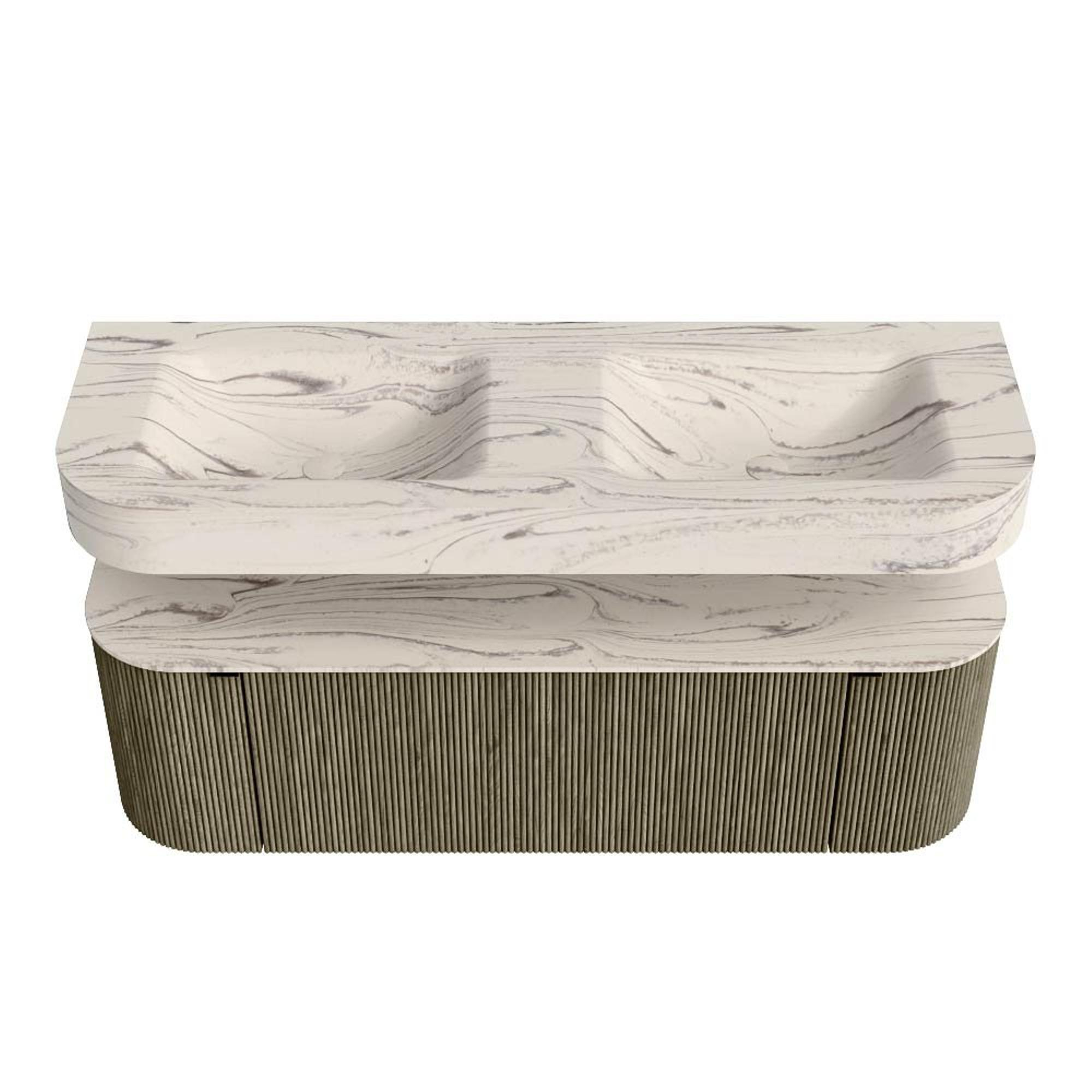 MONDIAZ THOR-DLUX 140cm badmeubel ronding links + rechts kleur Shadow met 1 lade en 2 deuren. Vrijhangende wastafel CLOUD Dubbel 2 kraangaten kleur Nata.