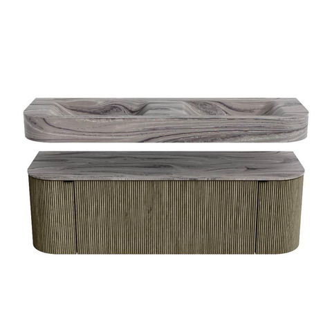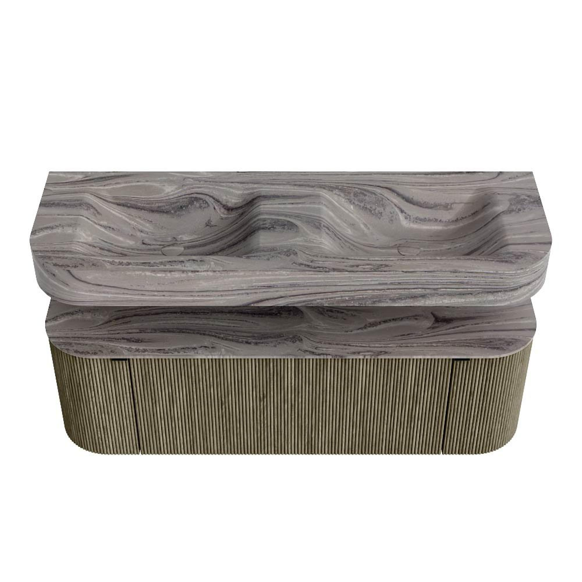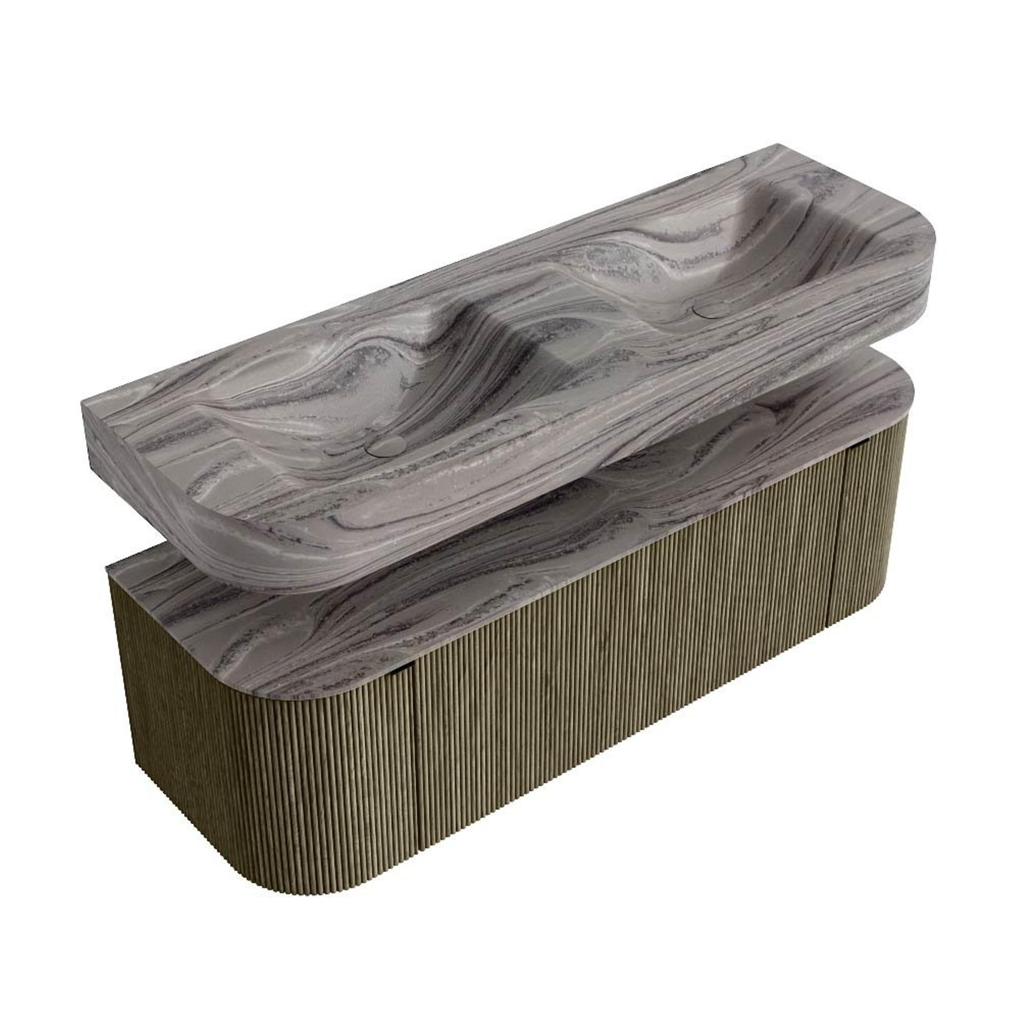 MONDIAZ THOR-DLUX 140cm badmeubel ronding links + rechts kleur Shadow met 1 lade en 2 deuren. Vrijhangende wastafel CLOUD Dubbel zonder kraangat kleur Sombra.