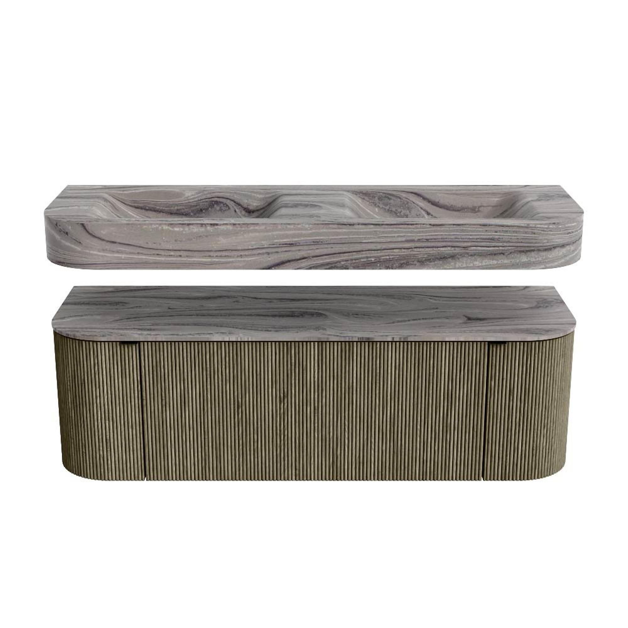 Boven het meubel zweeft een bijpassende, vrij hangende wastafel met afgeronde hoeken – perfect afgestemd op de vorm van de kast. De wastafel is uitgevoerd in Solid Surface en volgt subtiel de lijnen van het onderliggende meubel, waardoor een harmonieus geheel ontstaat. Het Solid Surface topblad vormt een sterke, onderhoudsvriendelijke basis en maakt de combinatie compleet.