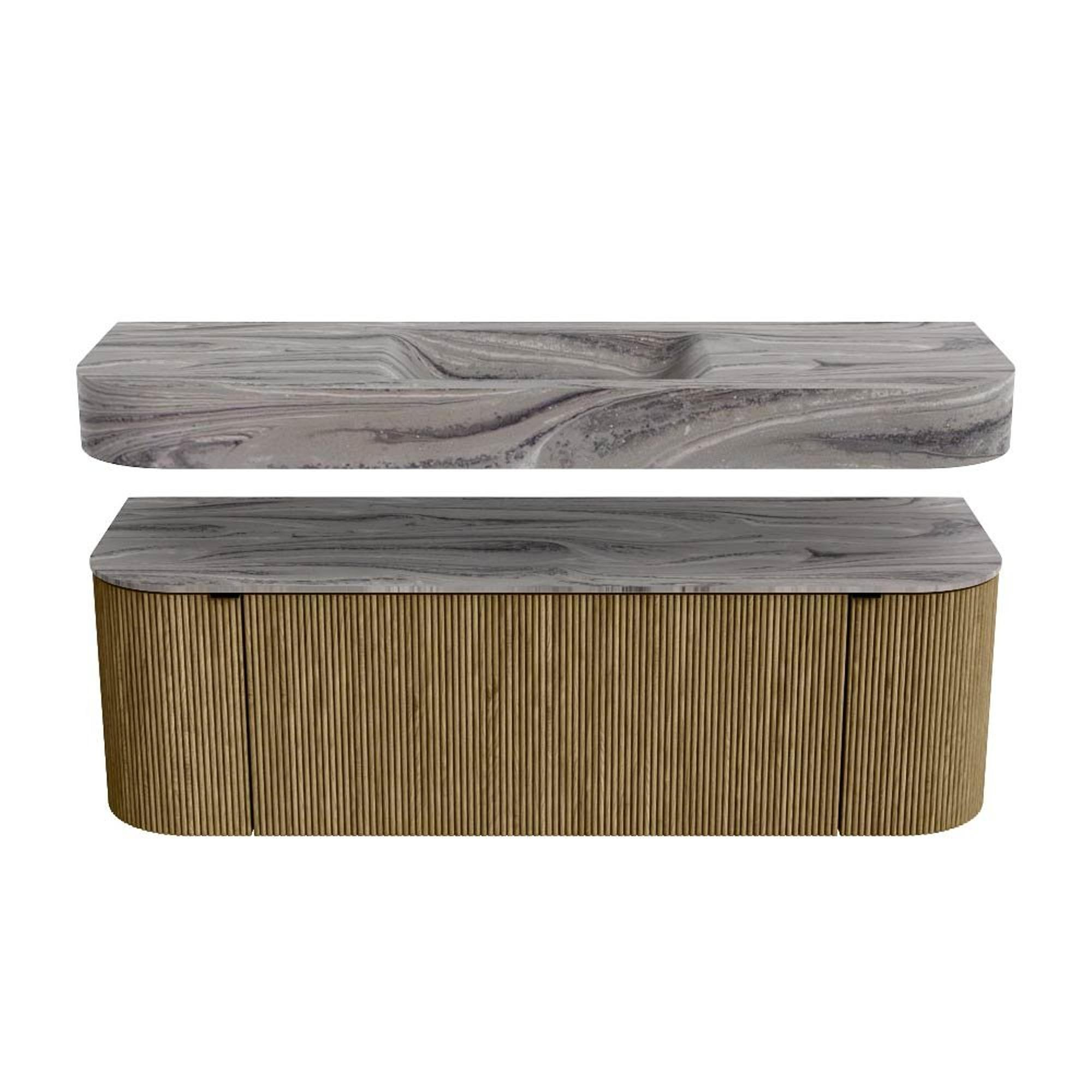 Boven het meubel zweeft een bijpassende, vrij hangende wastafel met afgeronde hoeken – perfect afgestemd op de vorm van de kast. De wastafel is uitgevoerd in Solid Surface en volgt subtiel de lijnen van het onderliggende meubel, waardoor een harmonieus geheel ontstaat. Het Solid Surface topblad vormt een sterke, onderhoudsvriendelijke basis en maakt de combinatie compleet.