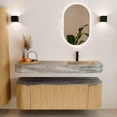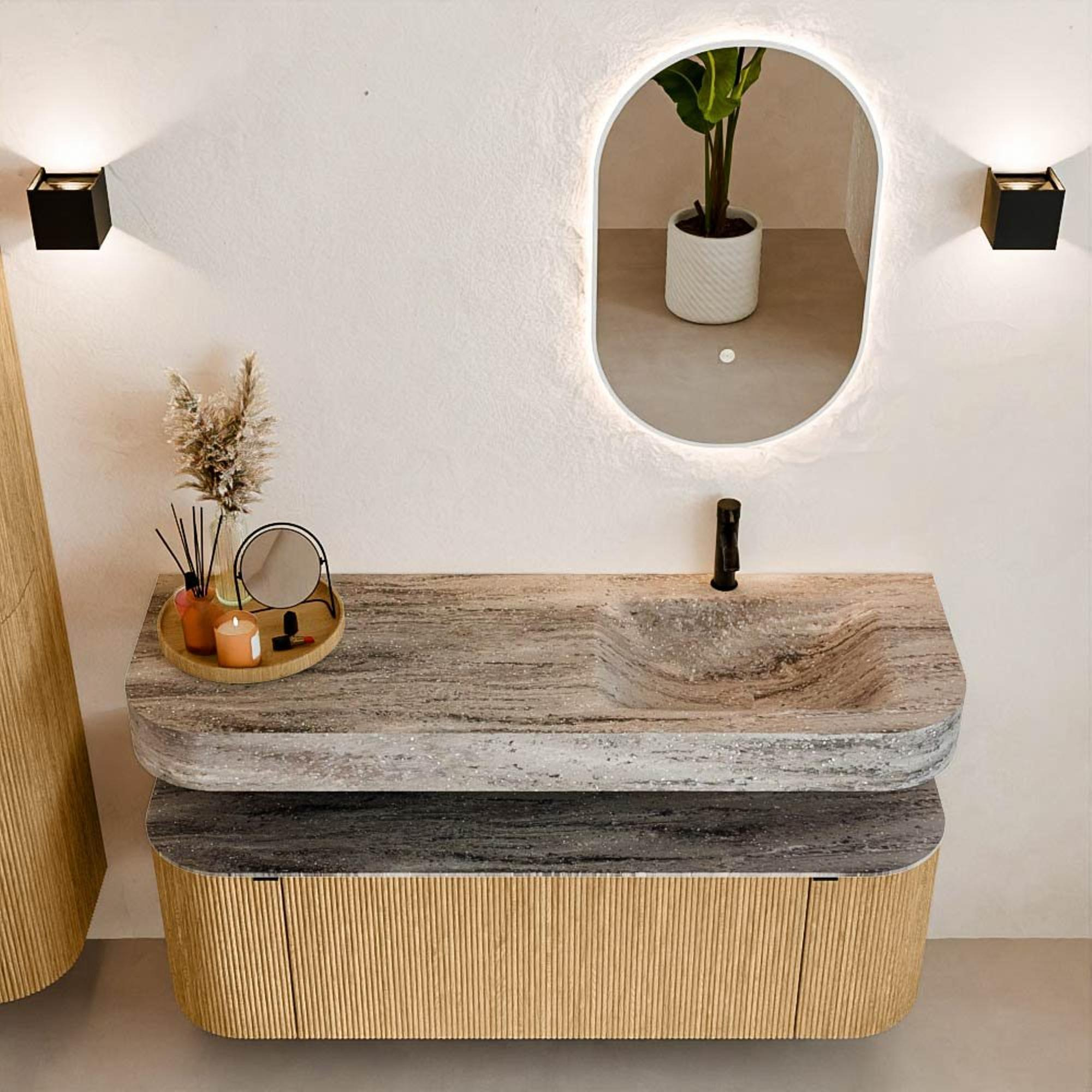 Natuurlijke materialen in warme tinten. De verticale ribbels brengen ritme en textuur in het ontwerp, terwijl het eikenhout zorgt voor een warme, ambachtelijke uitstraling. Kies uit 5 houttinten OAK, WALNUT, DUSK, SHADOW en RUBY zorgvuldig geselecteerde houtkleuren om zowel moderne als klassieke badkamers te verrijken.