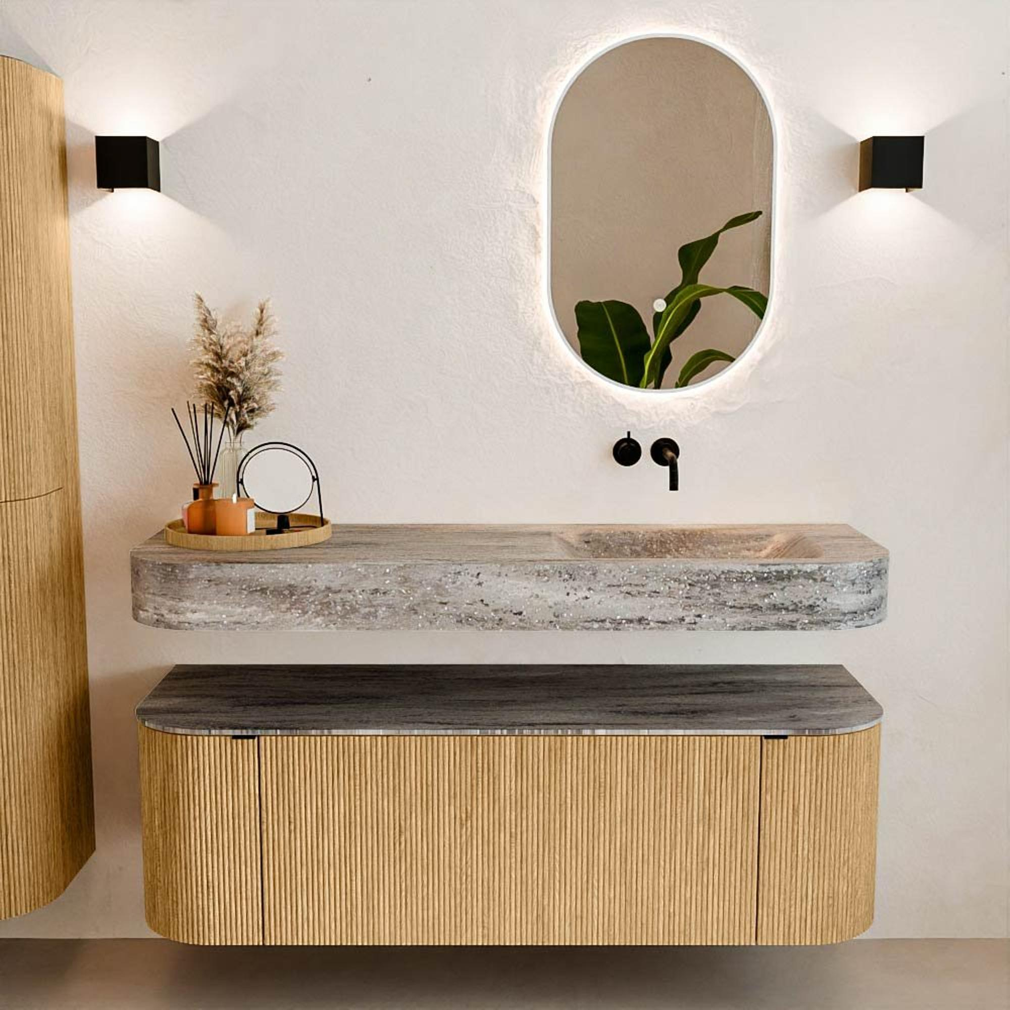 Natuurlijke materialen in warme tinten. De verticale ribbels brengen ritme en textuur in het ontwerp, terwijl het eikenhout zorgt voor een warme, ambachtelijke uitstraling. Kies uit 5 houttinten OAK, WALNUT, DUSK, SHADOW en RUBY zorgvuldig geselecteerde houtkleuren om zowel moderne als klassieke badkamers te verrijken.