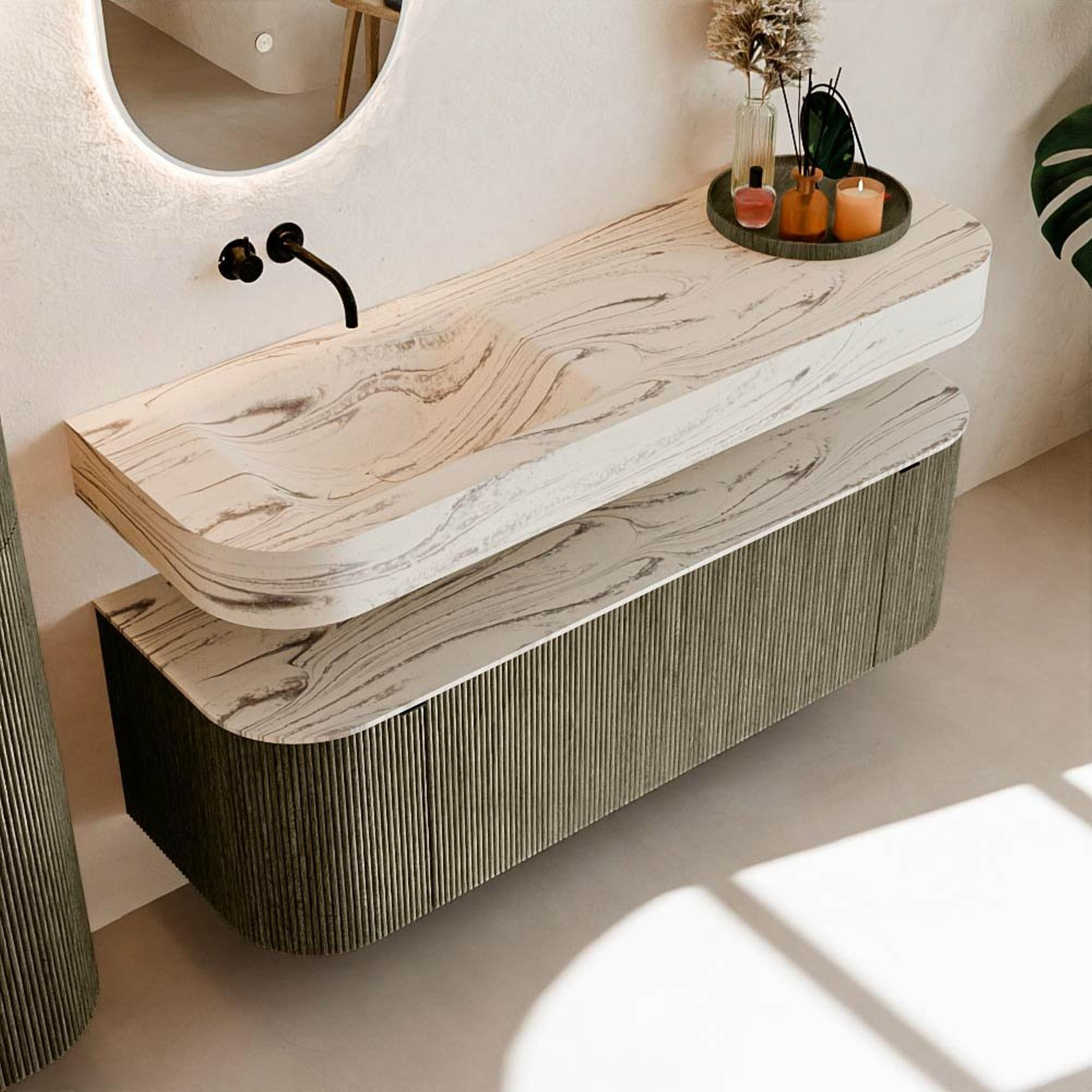 Boven het meubel zweeft een bijpassende, vrij hangende wastafel met afgeronde hoeken – perfect afgestemd op de vorm van de kast. De wastafel is uitgevoerd in Solid Surface en volgt subtiel de lijnen van het onderliggende meubel, waardoor een harmonieus geheel ontstaat. Het Solid Surface topblad vormt een sterke, onderhoudsvriendelijke basis en maakt de combinatie compleet.